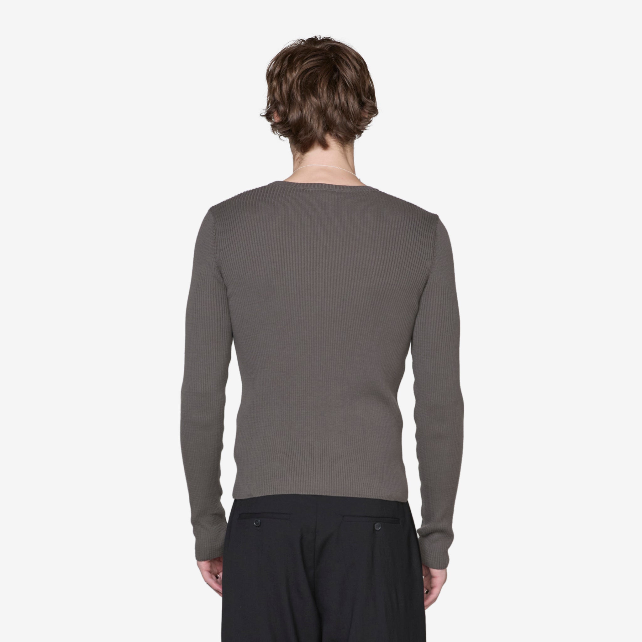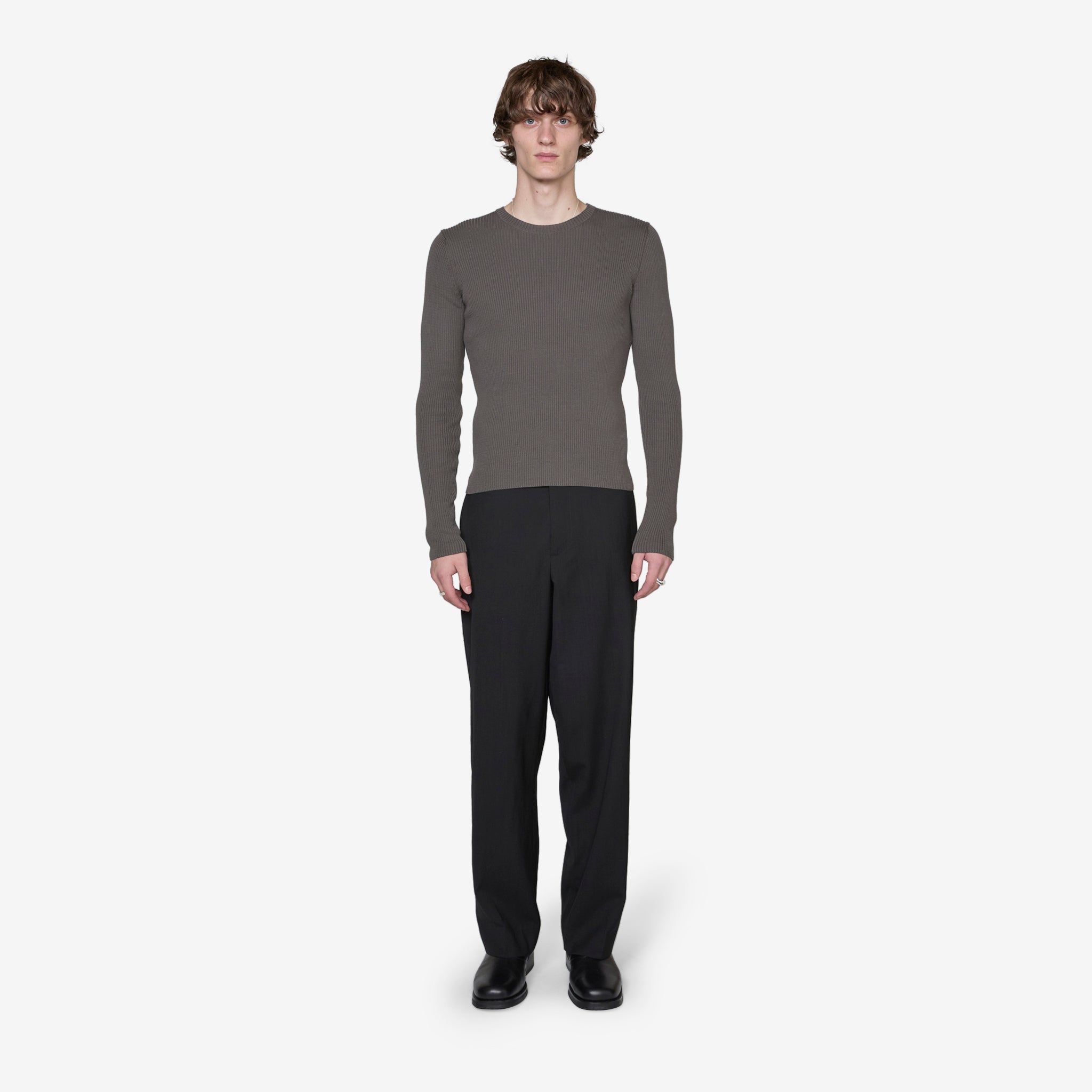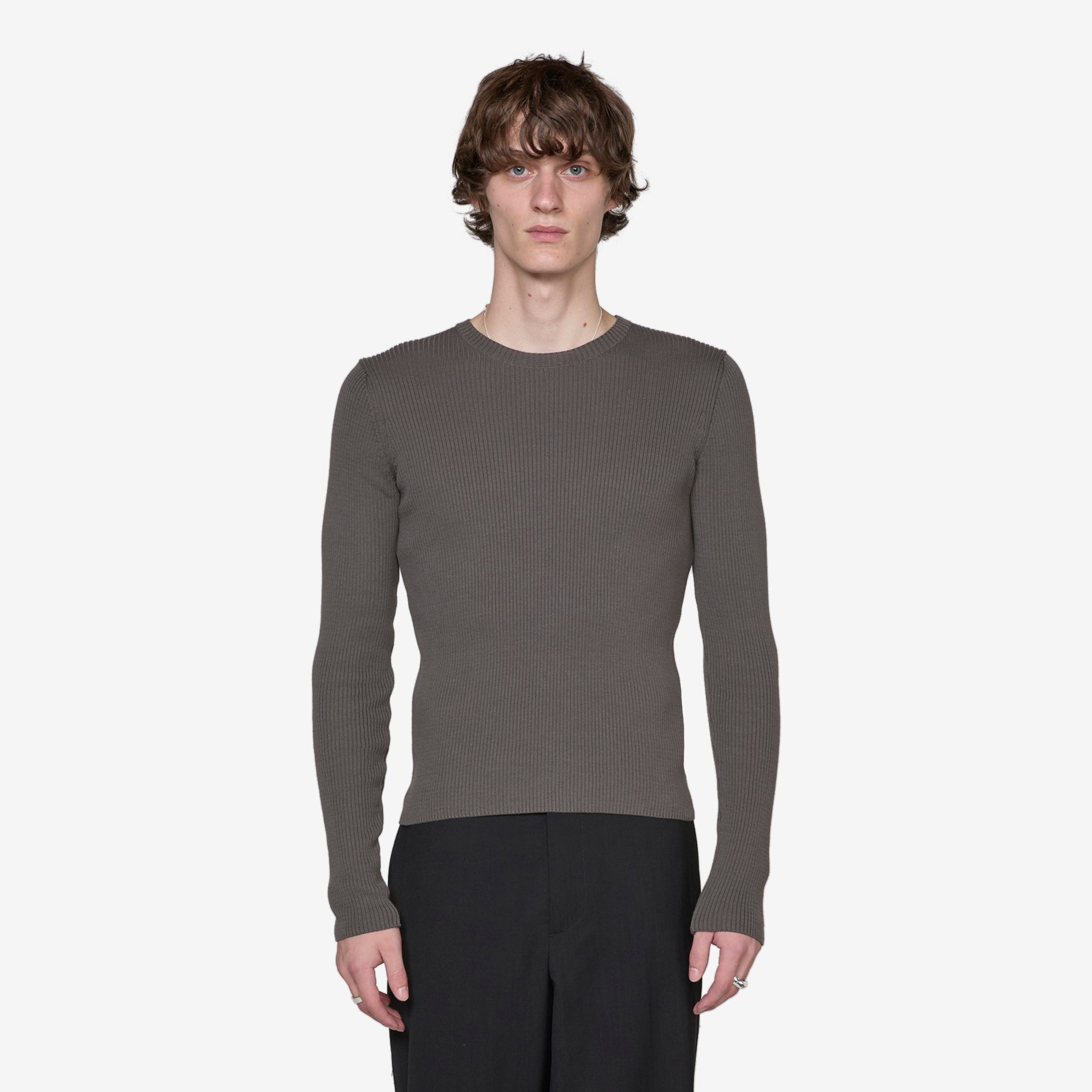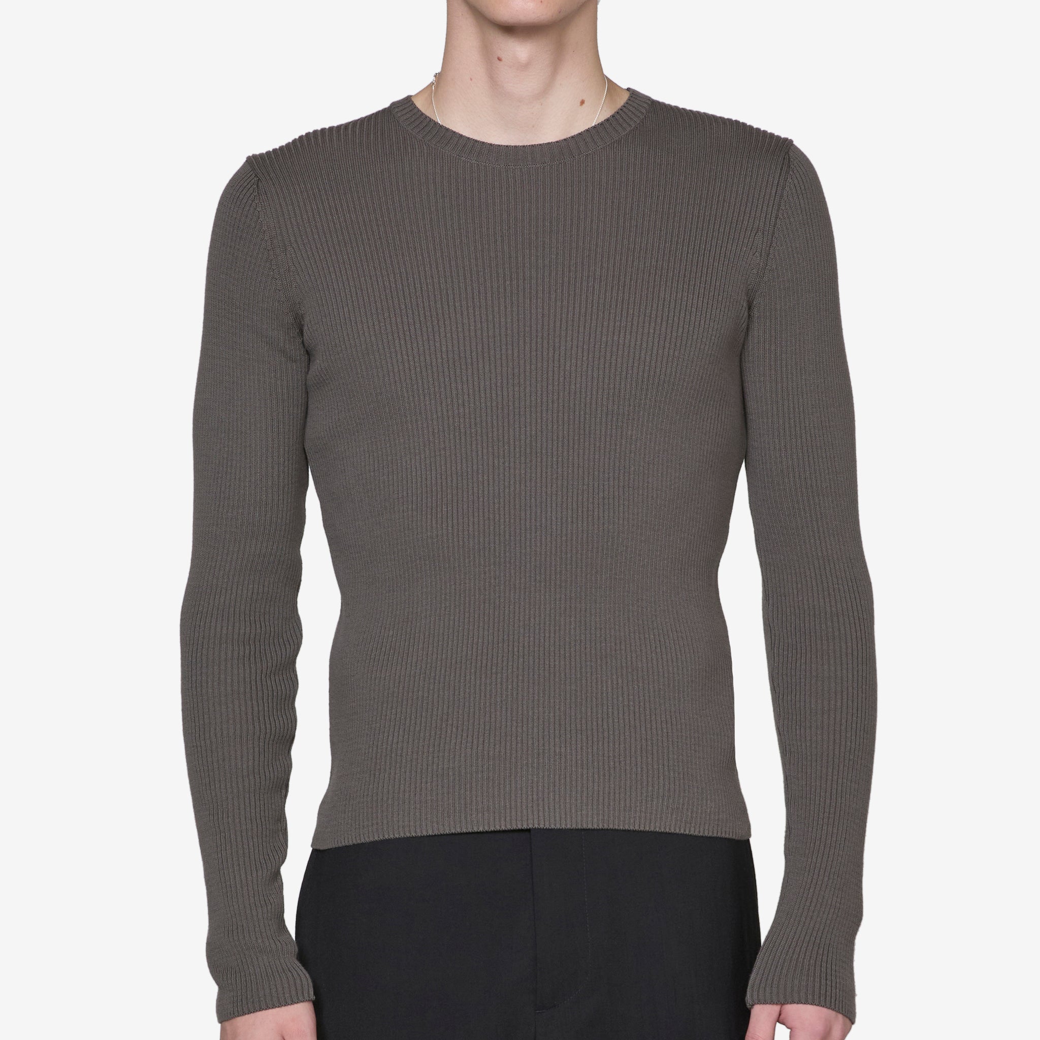 Compact Roundneck in Fog Clean Cotton from Our Legacy. Slim fit pullover sweater with a bound collar and overlocked hem and cuffs. Crafted from an Italian organic cotton yarn in a soft ribbed knit. This item is manufactured using a carefully sourced yarn. The natural characteristics of the yarn, combined with the construction of the knit allows the garment to expand when worn.This garment will be shaped by its wearer and naturally distress over time to finish the design process. To help keep the integrity of the garment please store the garment folded.