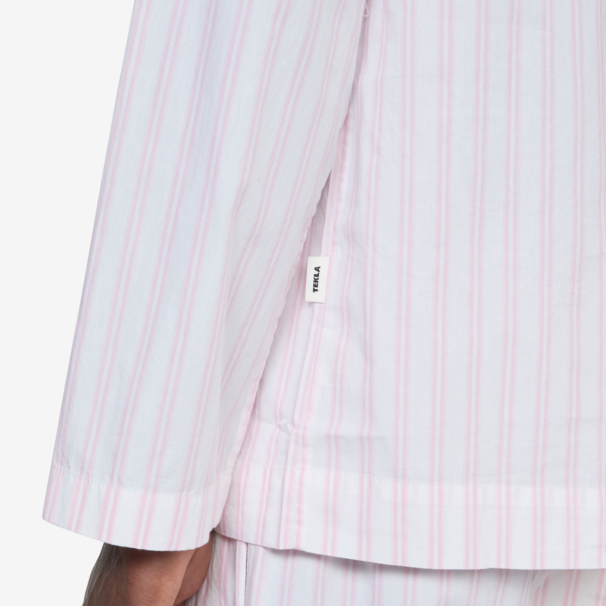 Unisex Cotton Poplin Pyjama Shirt in Hatty Stripes from Tekla. Oversized longsleeve shirt with a rounded collar, mother of pearl button closure and a single chest pocket. Crafted from tightly woven cotton poplin which has been stone-washed for a smooth and soft hand feel. Features french seams for a clean finish and the use of extra-long yarns to prevent pilling and guarantee a deep, pure colour.