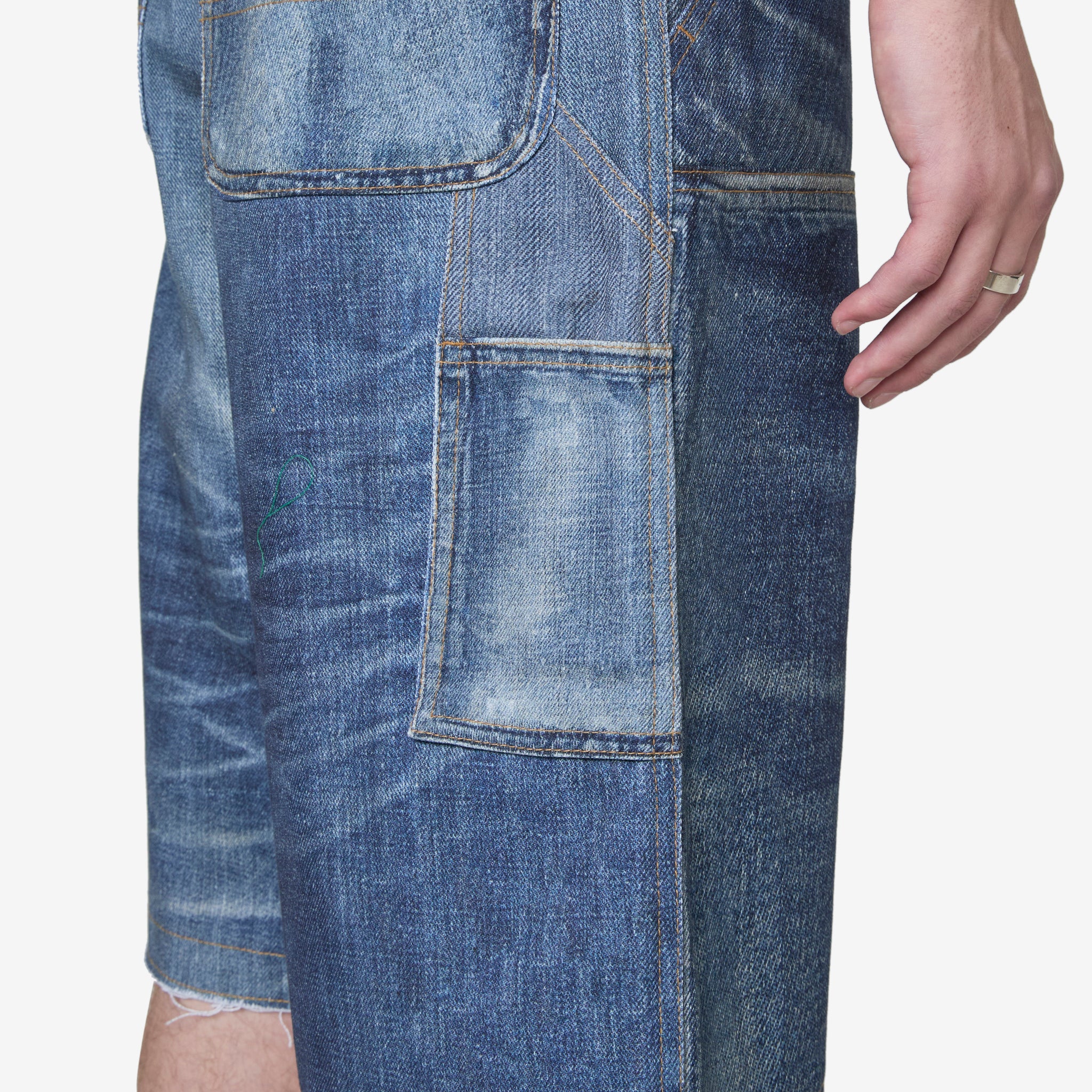 Denim Trompe L'oeil Double Knee Shorts in Blue from Andersson Bell. Knee-length shorts with a belt loop waistband, 4-pocket construction, a carpenter picket on the right thigh and double knee detailing. Crafted from a trompe l'oeil print denim with raw hem and contrast panel detailing. Finished with a branded jacron on the rear waistband and an embroidered brand patch on the rear pocket.