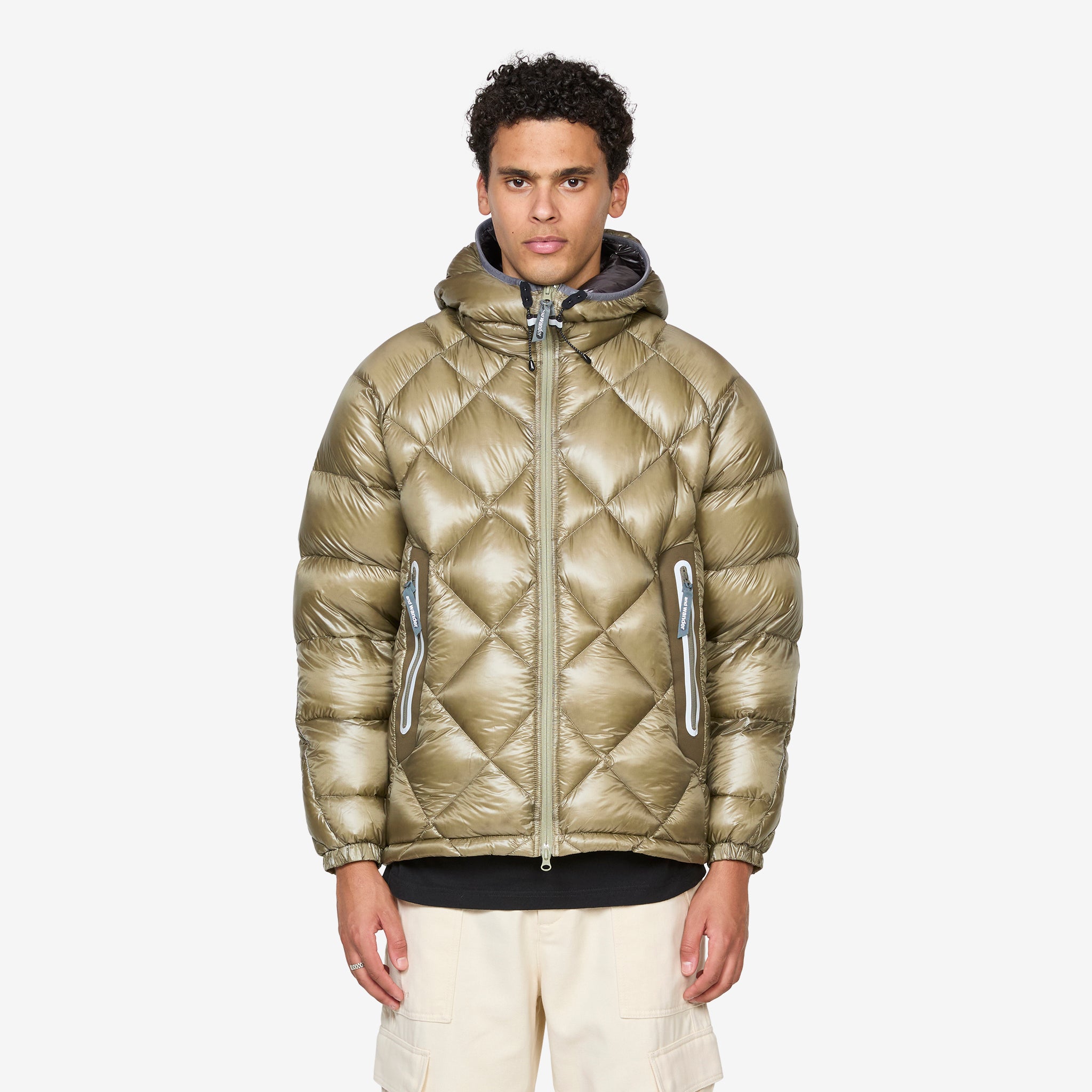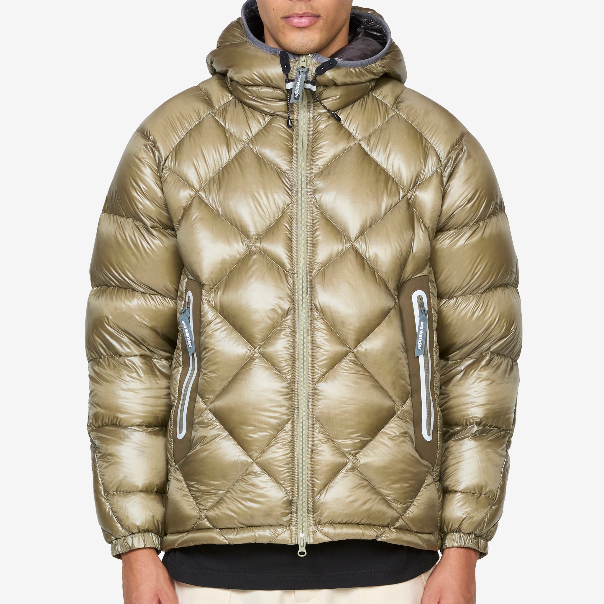 Diamond Stitch Down Jacket in Light Khaki from and wander. Cold-weather shell built from water-repellent Pertex® Quantum nylon and insulated with premium goose down fill. Lightweight yet warm, it features a packable design, reflective detailing for visibility, and practical touches like a drawstring hood, zip front, and side pockets.