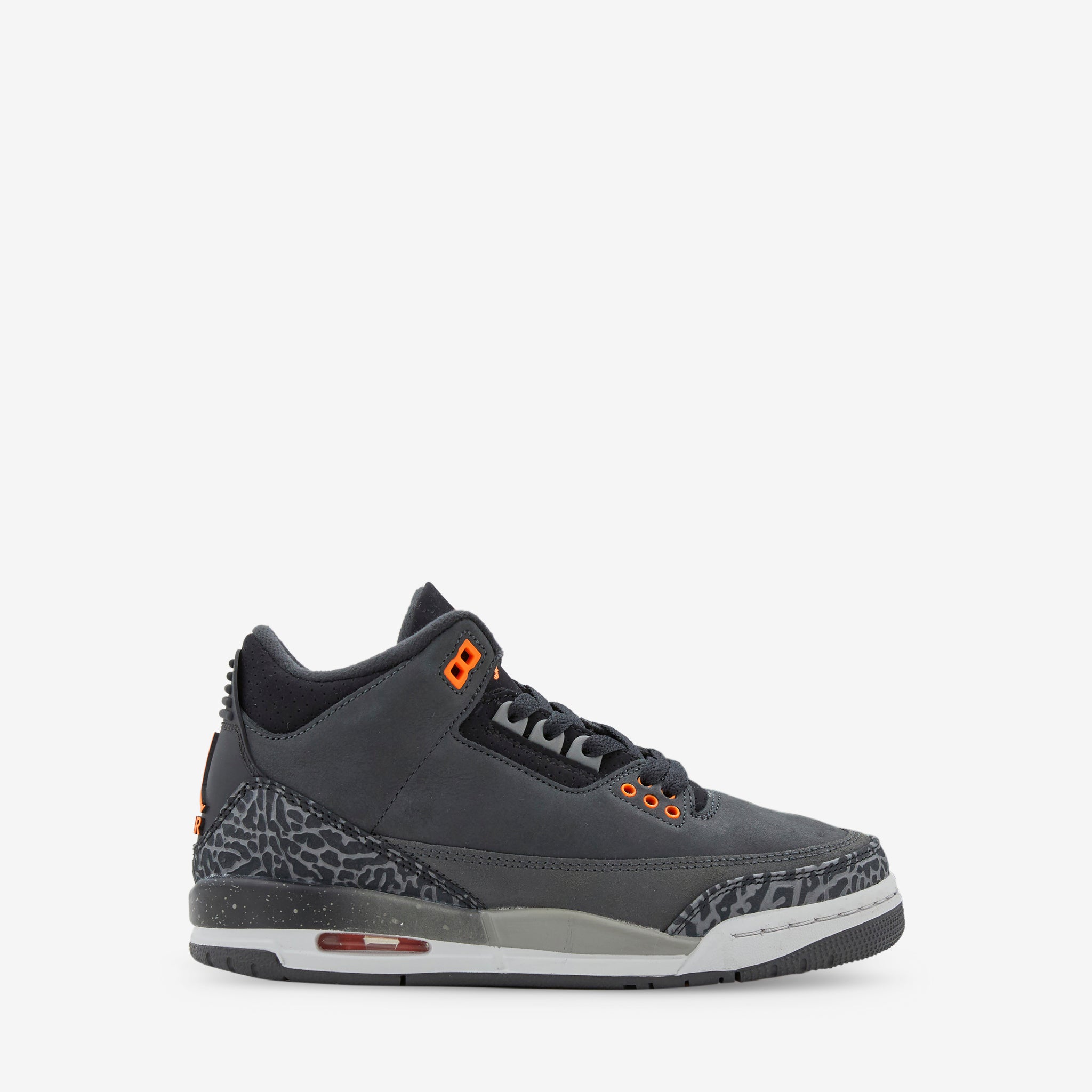 Grade School Air Jordan 3 Retro in Night Stadium, Total Orange and Black from Jordan Brand. Bold colours and classic details on the upper as well as a padded collar for comfort. The flexible foam midsole provides support whilst the solid rubber outsole offers durable traction.