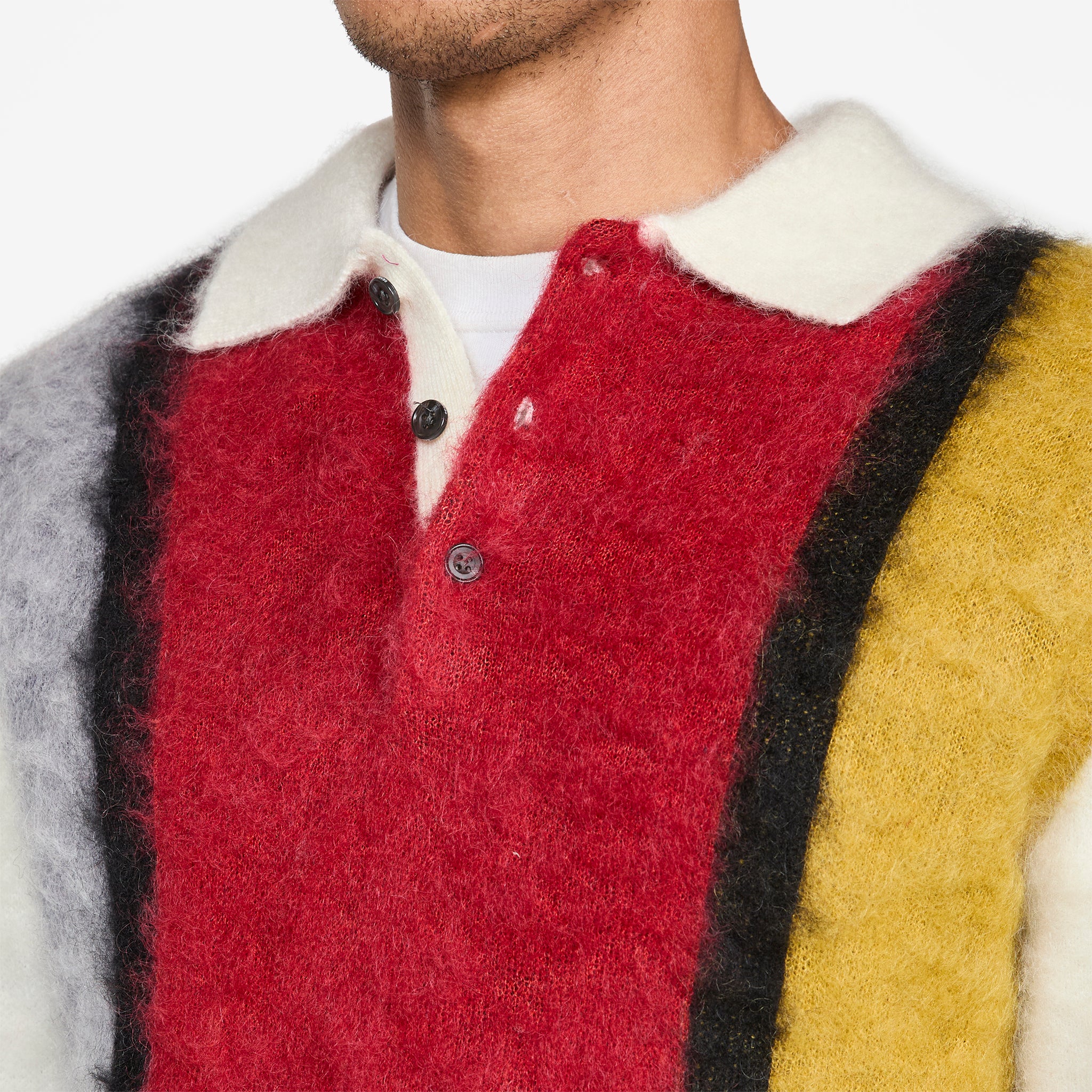Knit Polo Shaggy 9G in White from Beams Plus. Regular fit polo with a 3-button placket, classic collar and ribbed trims. Crafted from a 9-gauge furry wool blend knit, featuring a rare 1/13 kid mohair blend yarn from Angora goats. Finished with jacquard colour blocks throughout the torso.