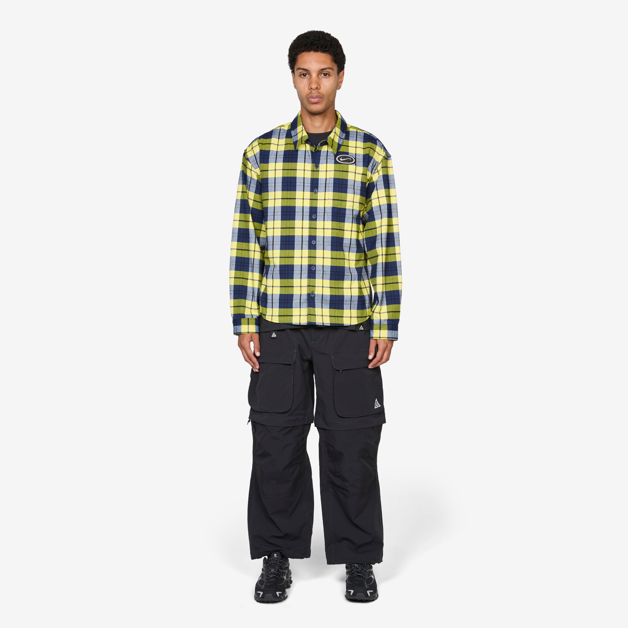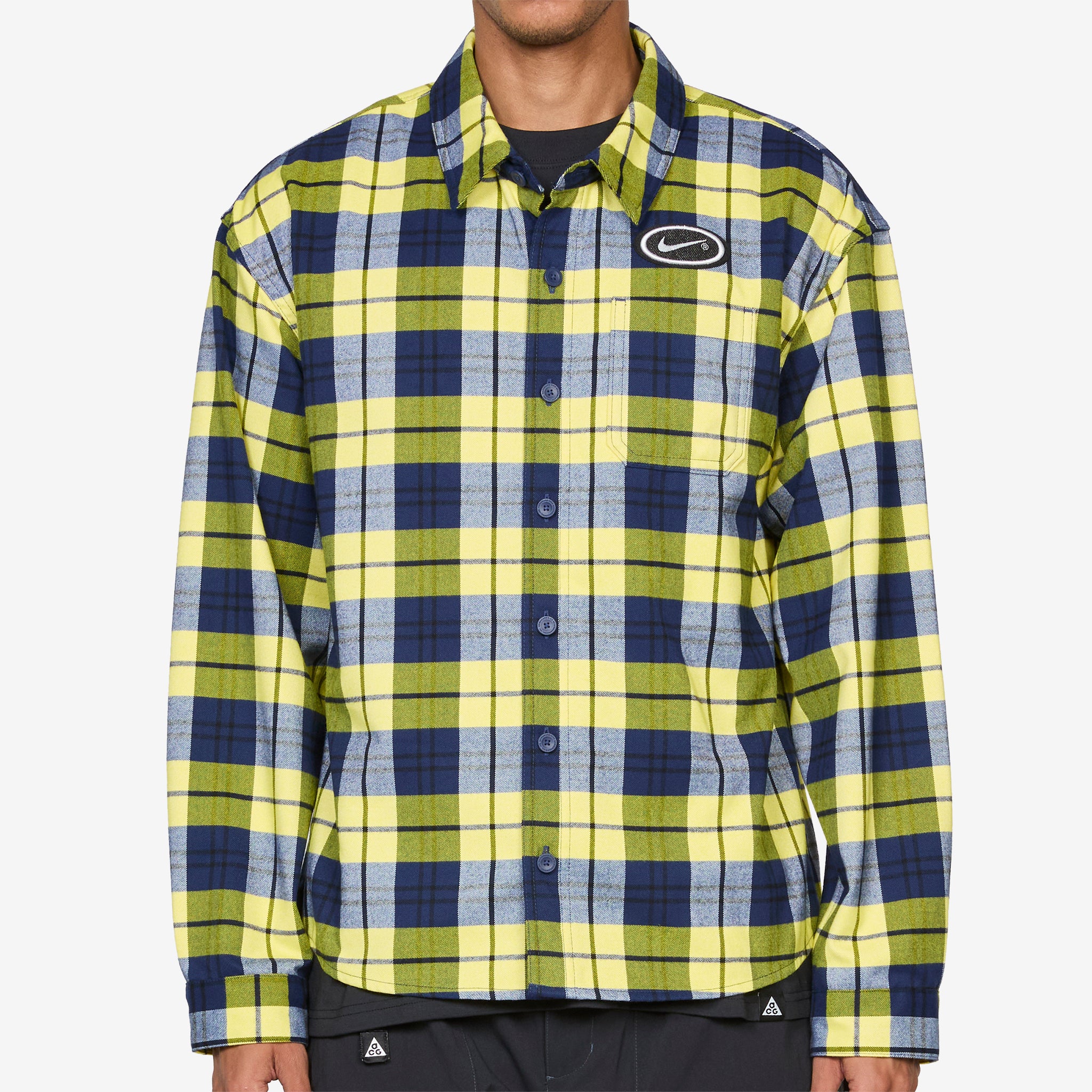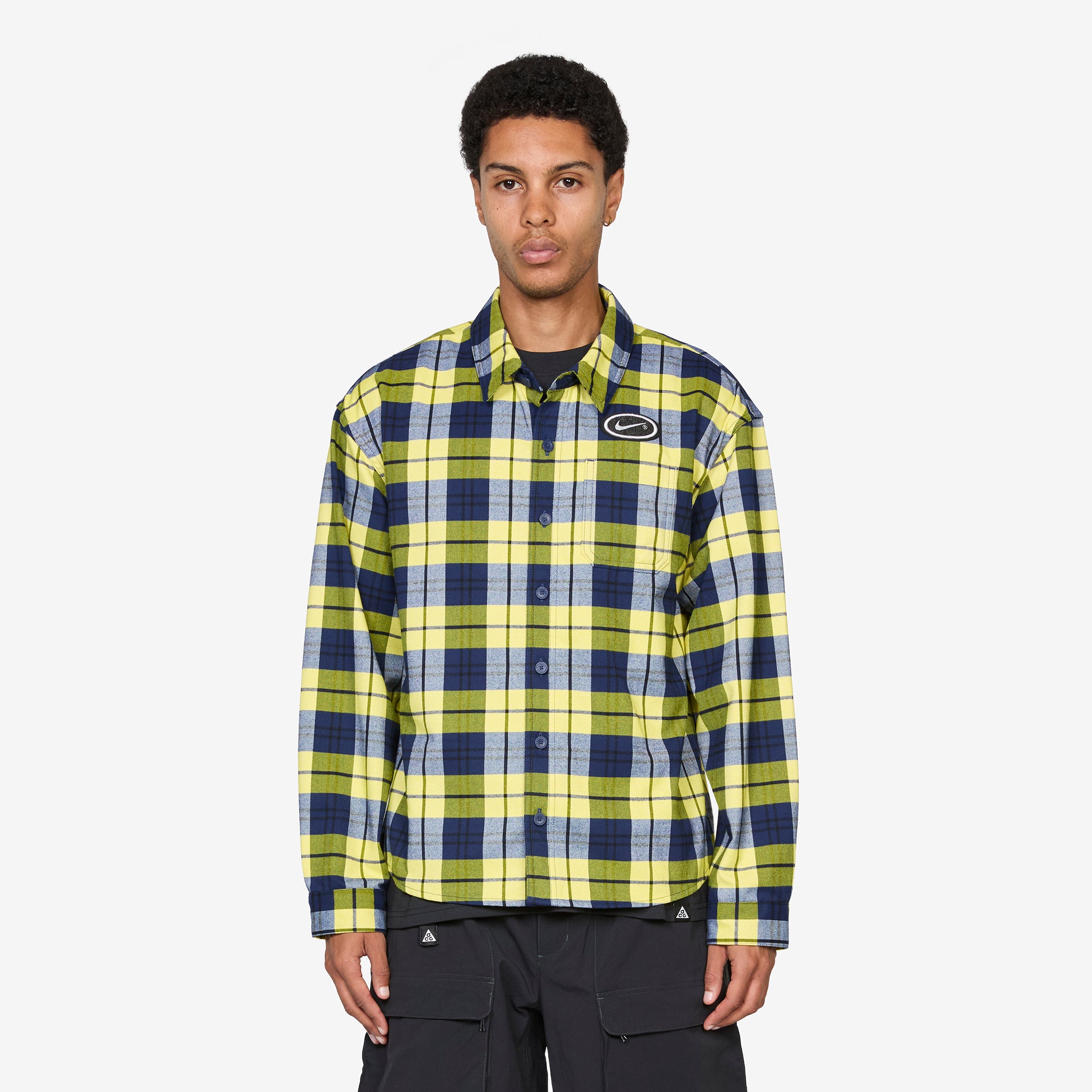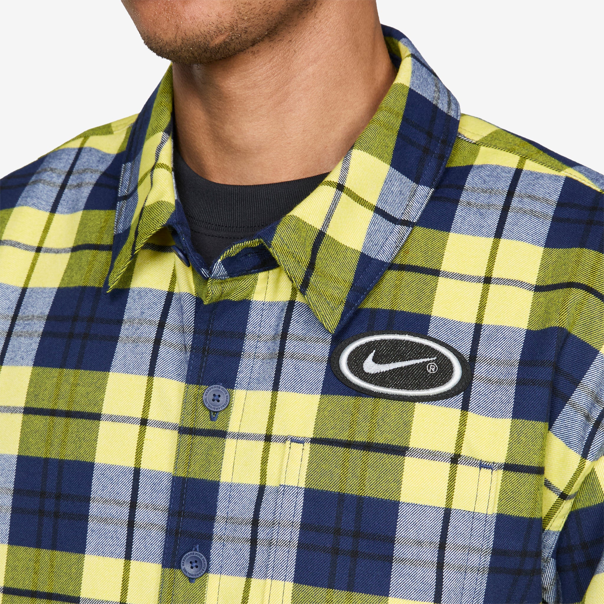 Koston Flannel Longsleeve Button Up in Midnight Navy and Speed Yellow from Nike SB. Relaxed fit flannel shirt with a classic collar, full button closure and surved hem. Crafted from a soft plaid material and finished with a reflective woven brand patch at the chest.