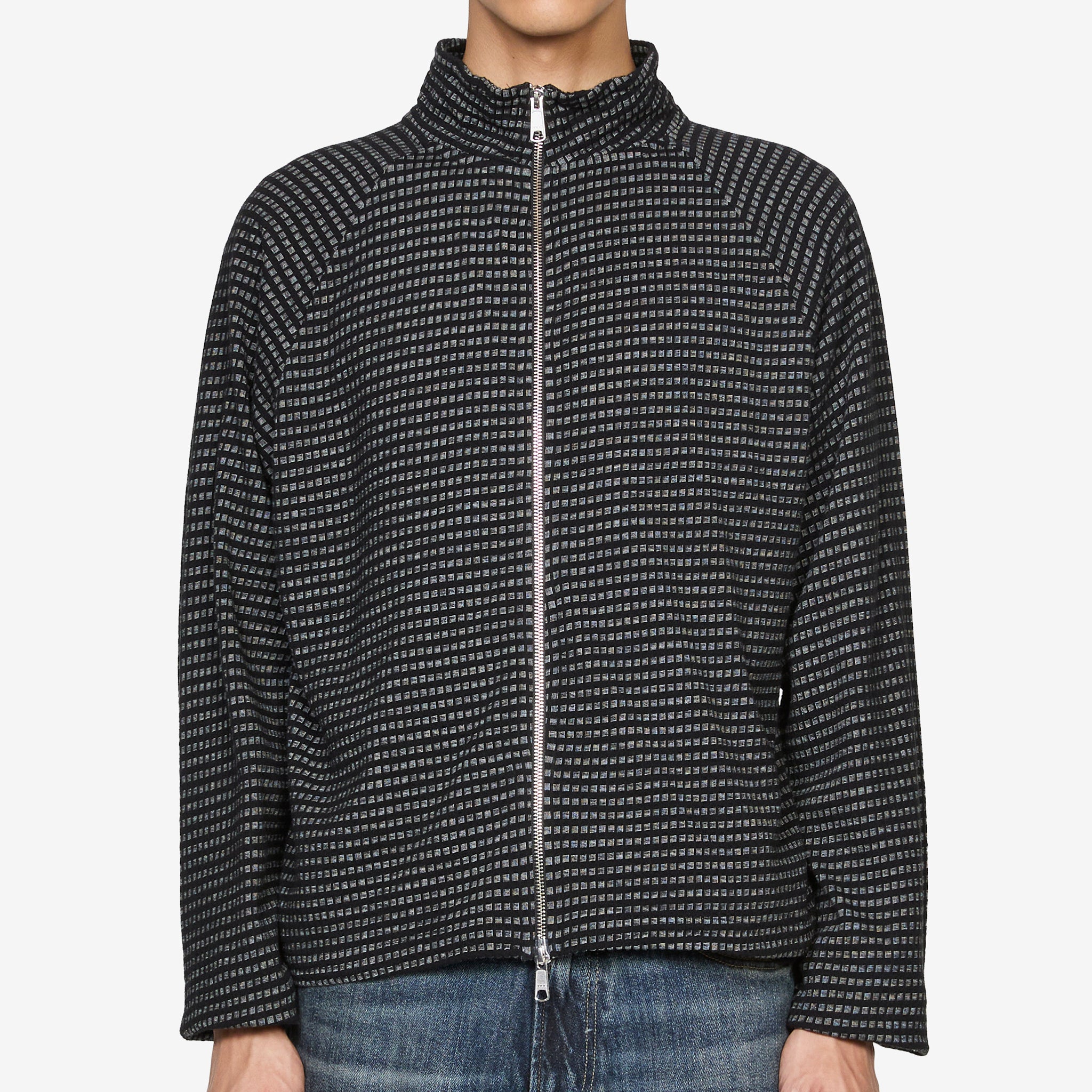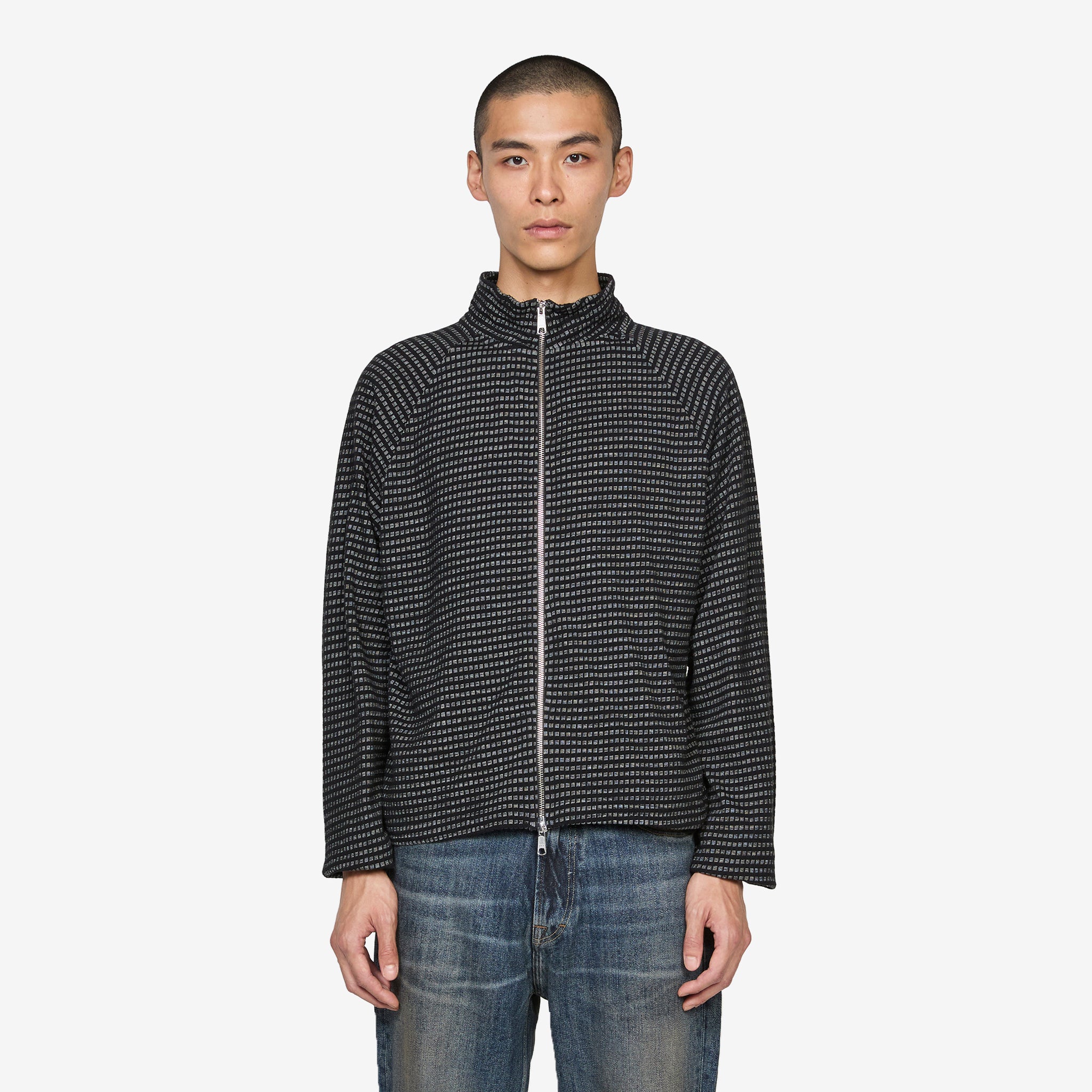 Leisure Zip Up in Black Experienced Check from mfpen. Regular fit zip up with a stand collar, 2-way zip closure and raglan sleeves. Crafted from a soft, garment-washed, lightweight organic cotton jersey with reversed flatlock seam construction. Finished with a jacquard black and grey check pattern throughout the material.