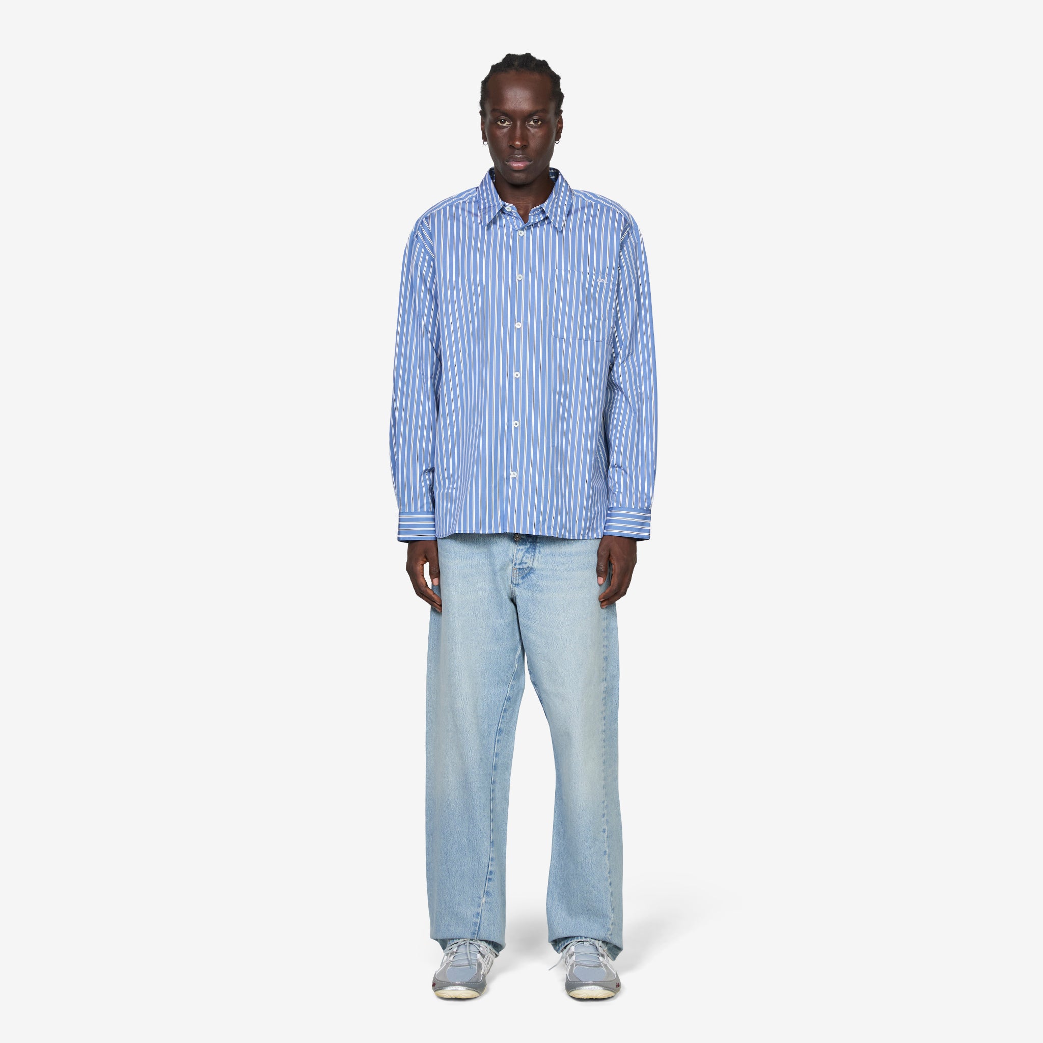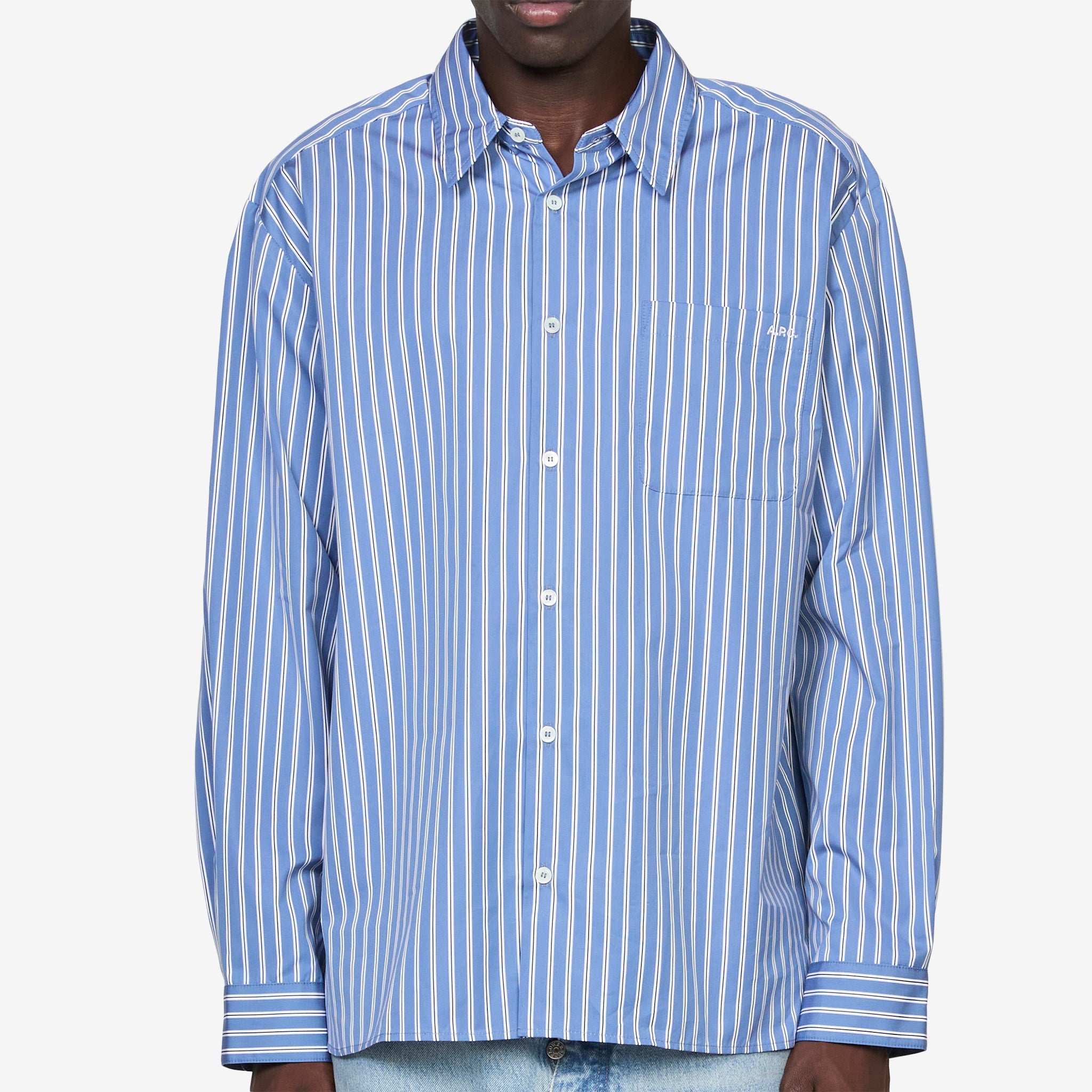Malo Poplin Shirt in Glacier Blue from A.P.C. Straight, loose cut longsleeve shirt with a curved hem, full button closure, button cuffs and a classic collar. Crafted from Portuguese organic cotton. Finished with a single patch pocket on the chest.