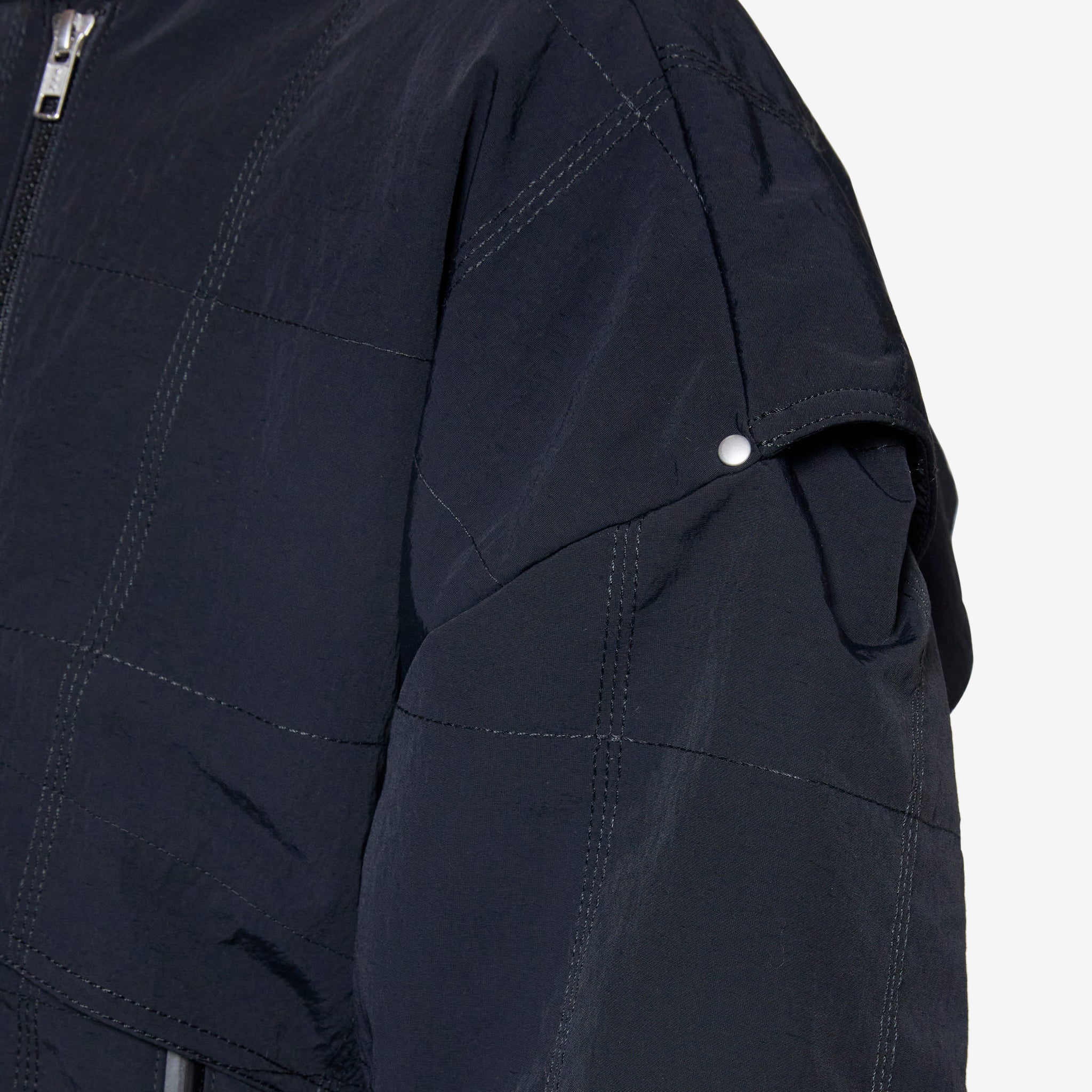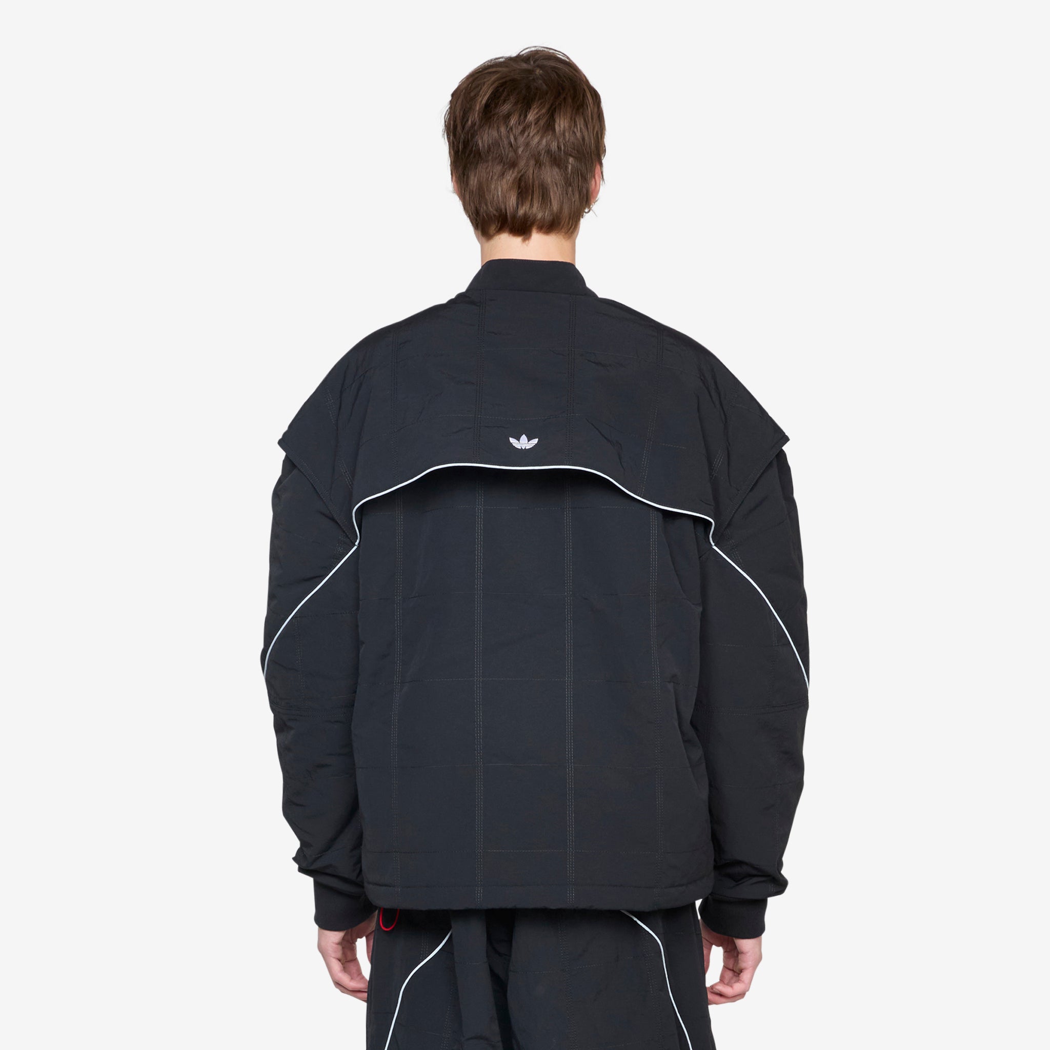 Motor Ave Racer Jacket in Black Adidas Originals. Relaxed fit jacket with articulated drop shoulder, asymmetrical zip and adjustable hem. Crafted with peached woven material. Finished with reflective piping and ribbed cuffs.