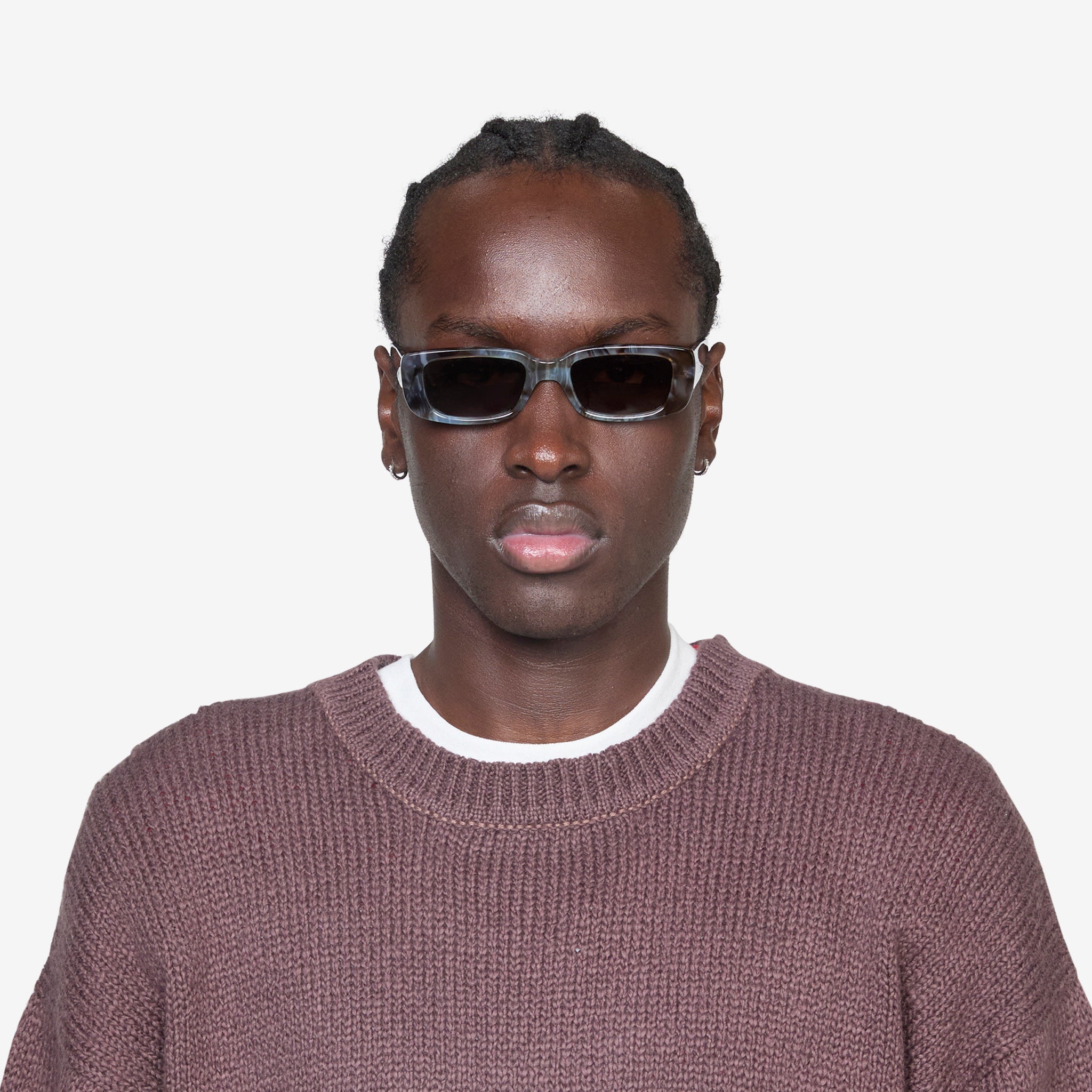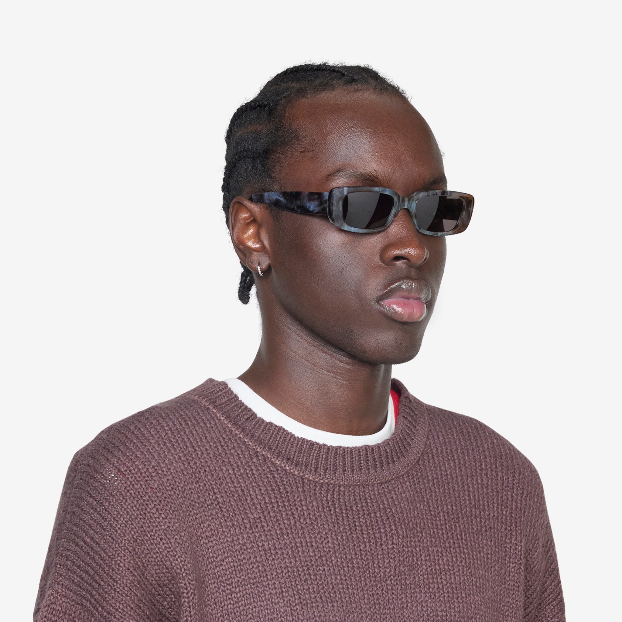 Odessa Sunglasses in Steel Blue and Dark Grey from A Kind Of Guise. Wide, narrow sunglasses with a thick, transparent blue frame and dark grey lenses. Arrives in a premium-crafted paperboard box and a logo-stamped case. Handmade in Germany with Certified Carl Zeiss® lenses and an acetate frame.