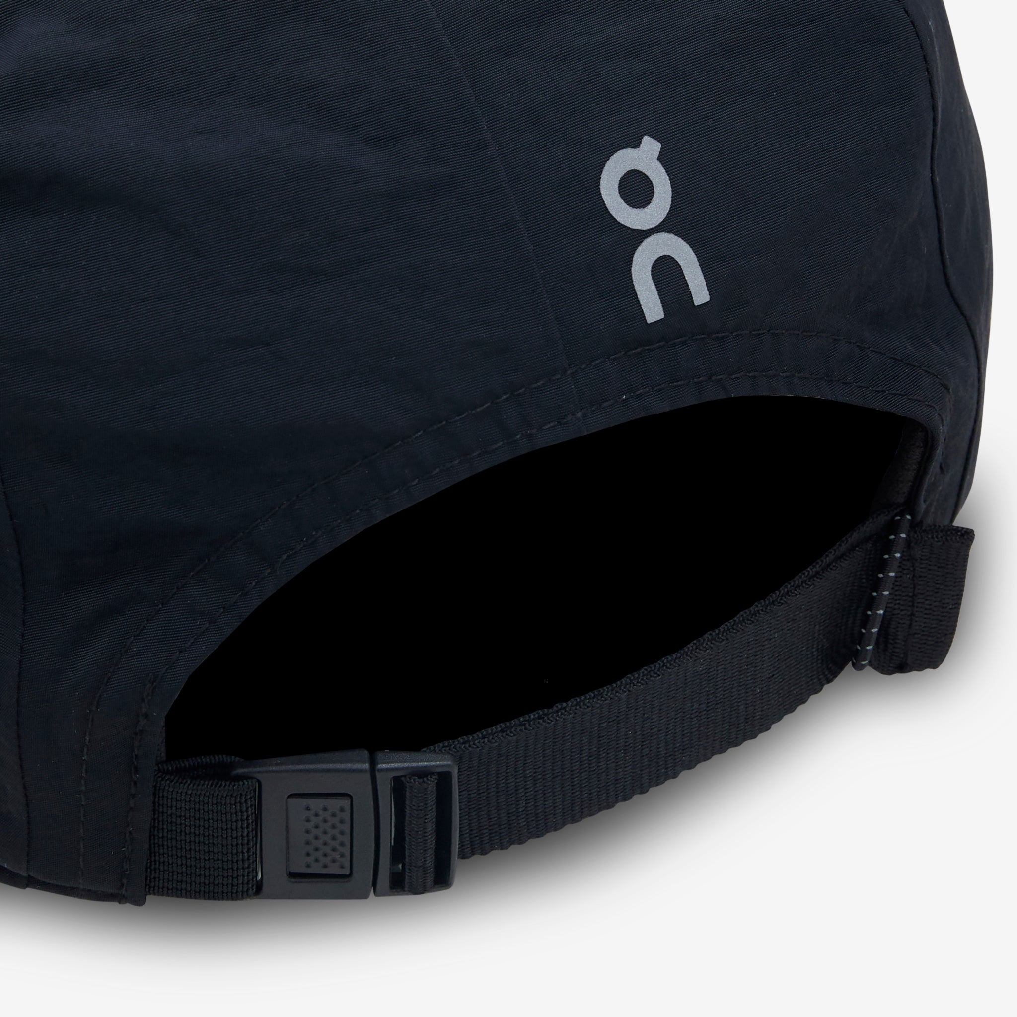 Performance Cap in Black from On. 5-panel running cap with an adjustable back strap and laser perforation. Crafted from breathable recycled nylon and finished with an internal sweatband and printed branding on the front.