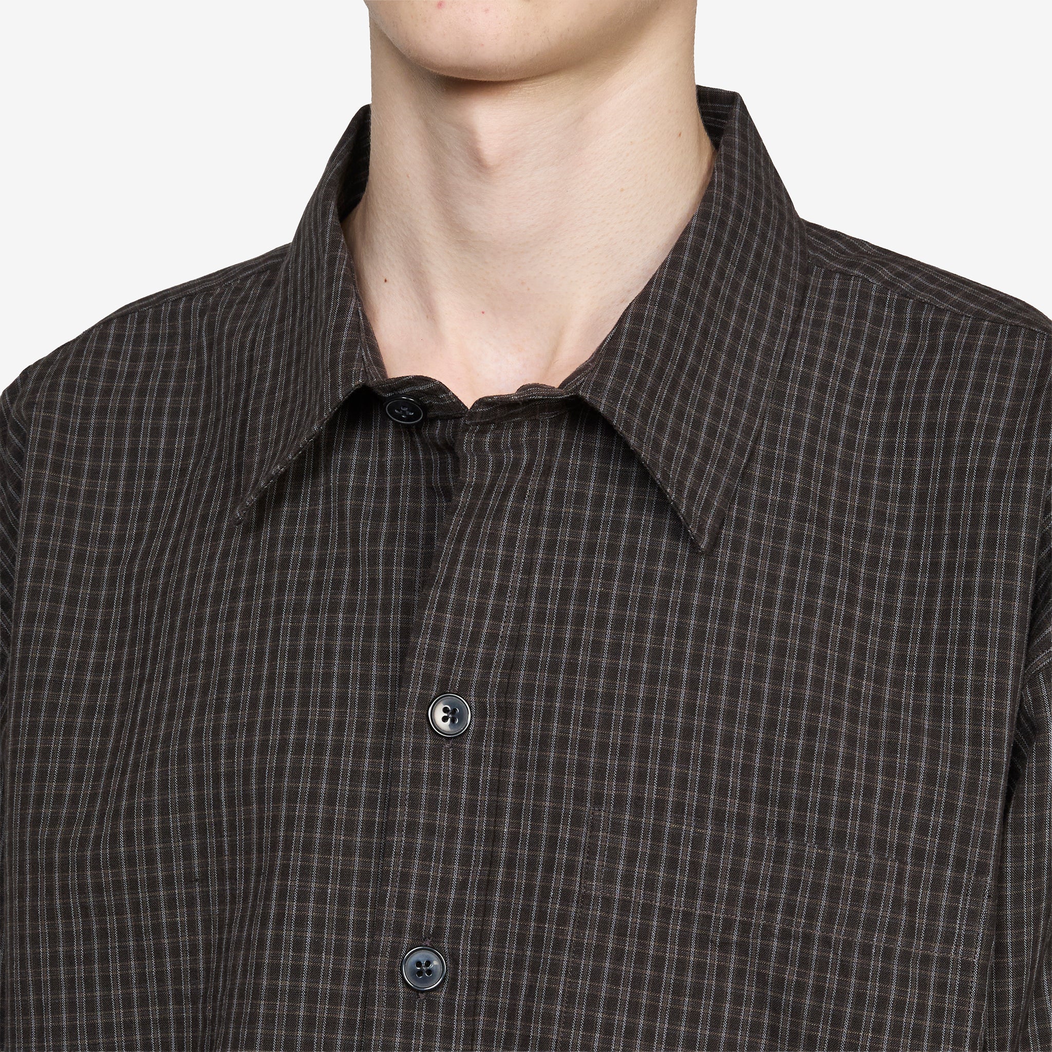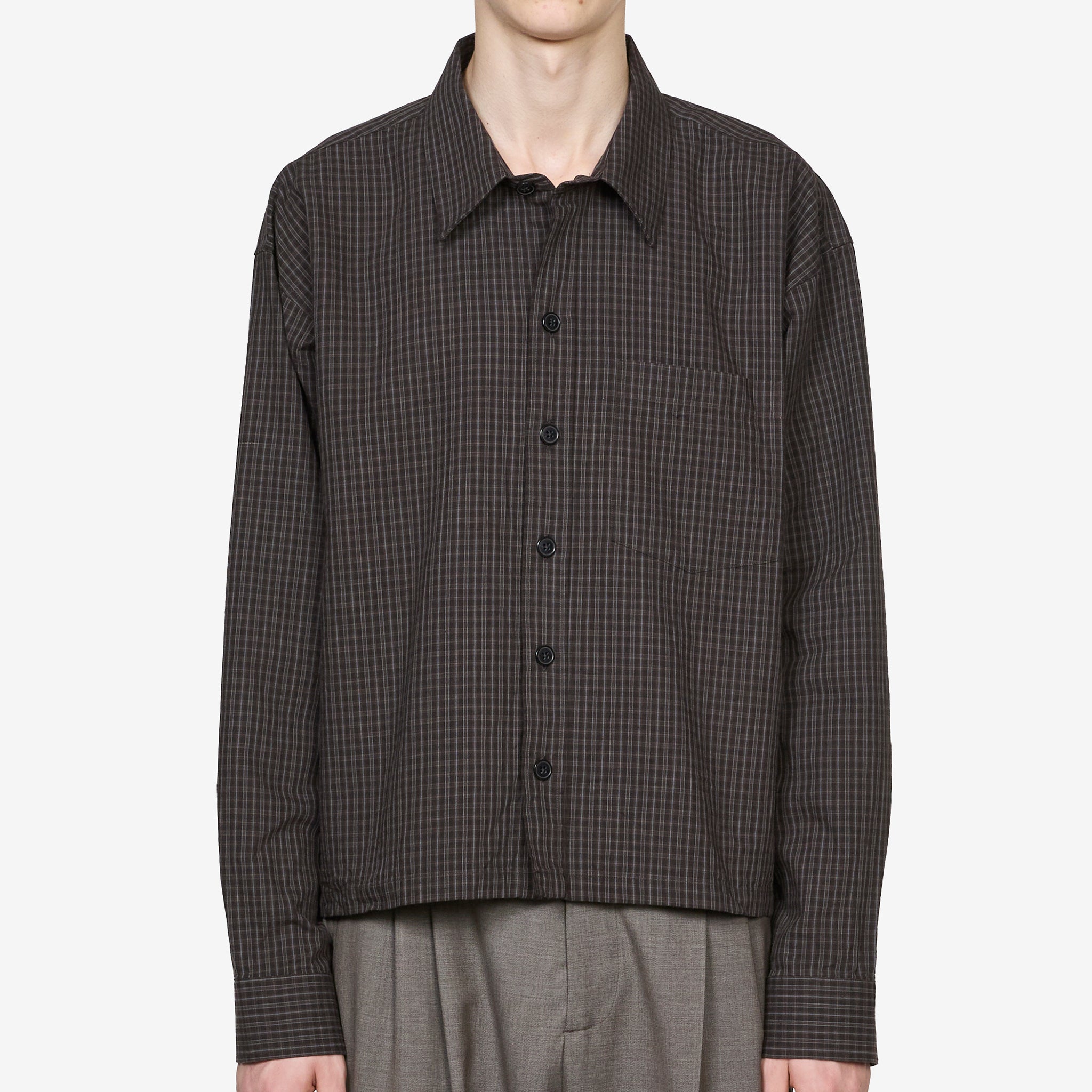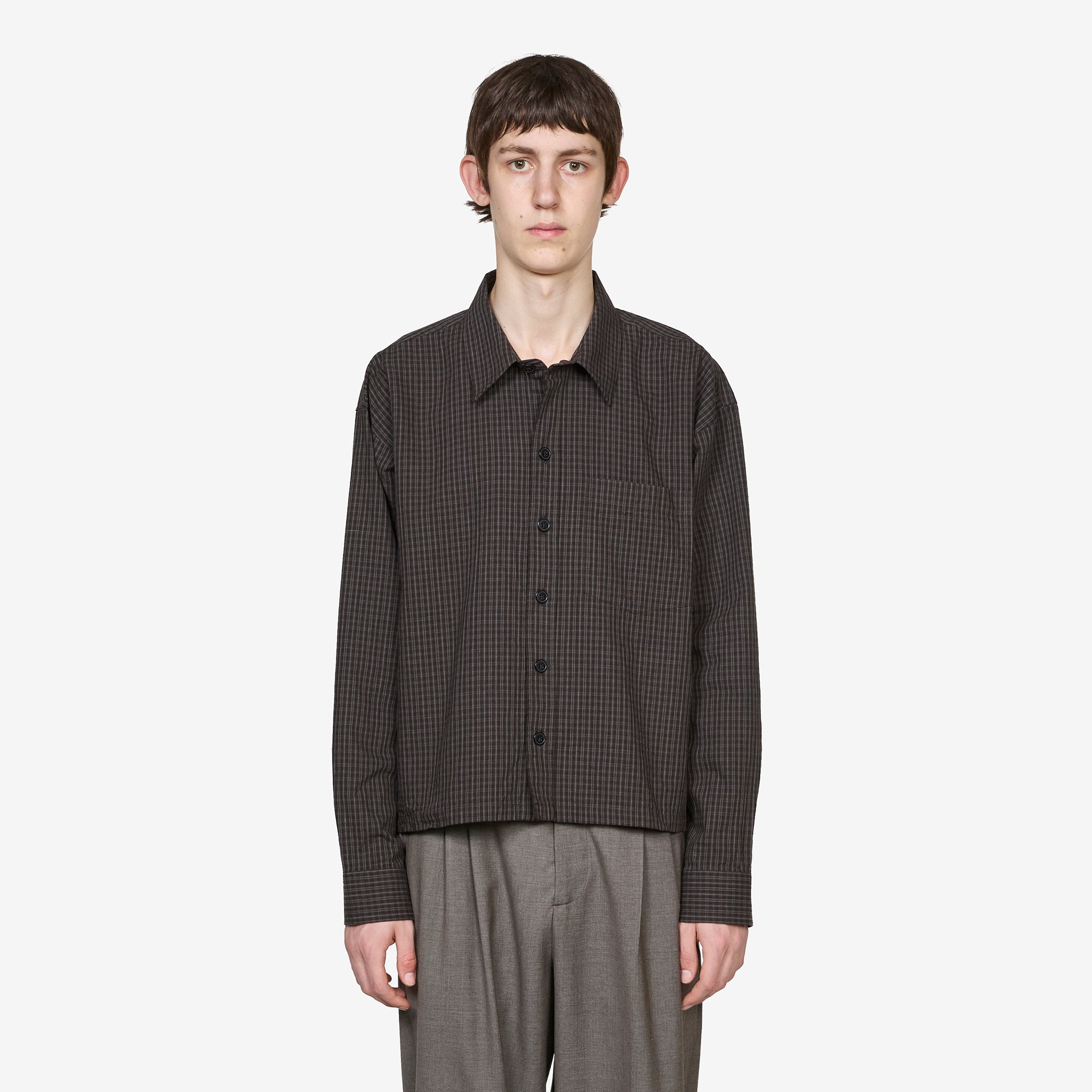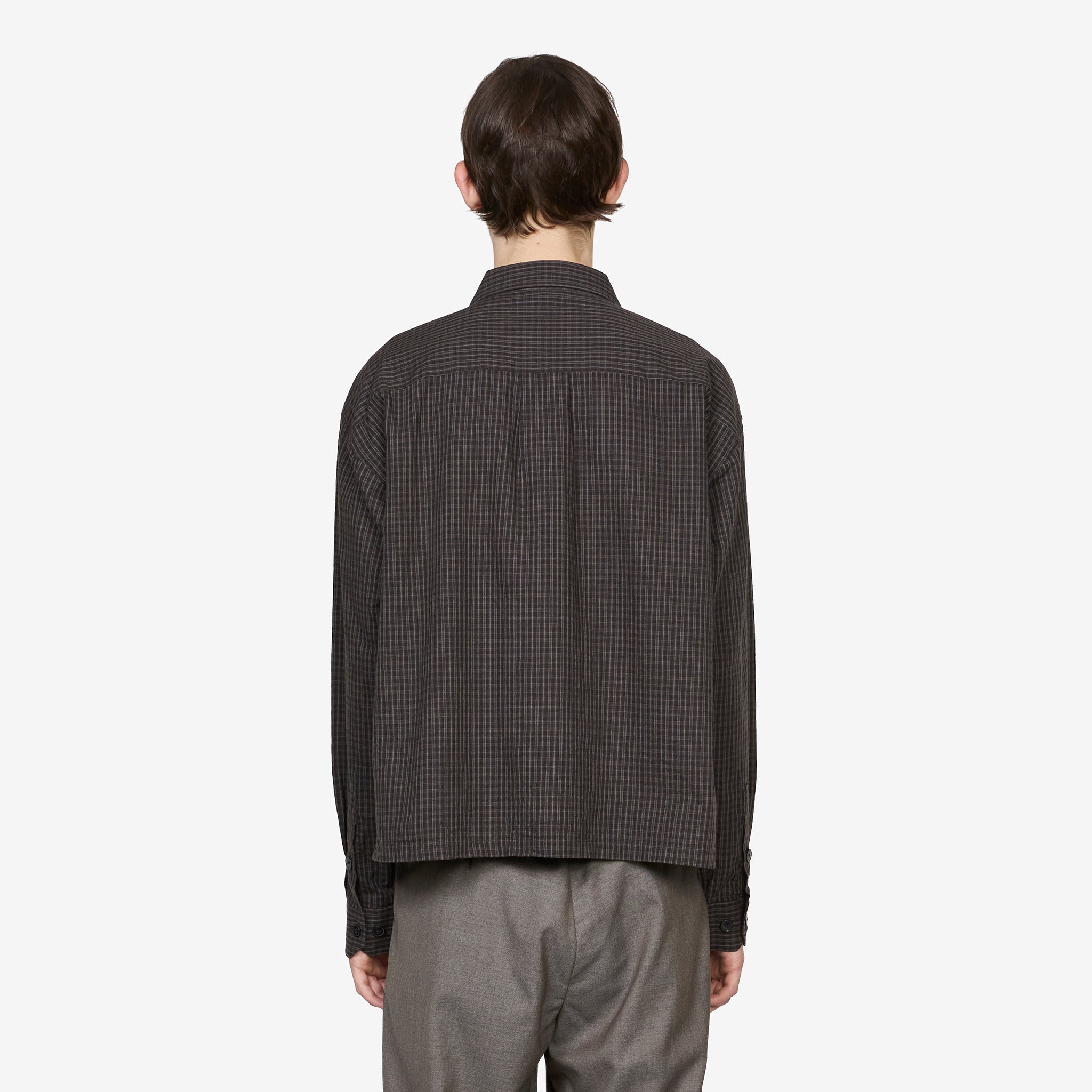 Priority Shirt in Dark Linen Check from mfpen. Relaxed fit shirt with a boxy crop, dropped shoulders, spread collar and straight hem. Crafted from a lightweight garment washed cotton blend and finished with a pleated back yoke and single patch pocket on the chest.