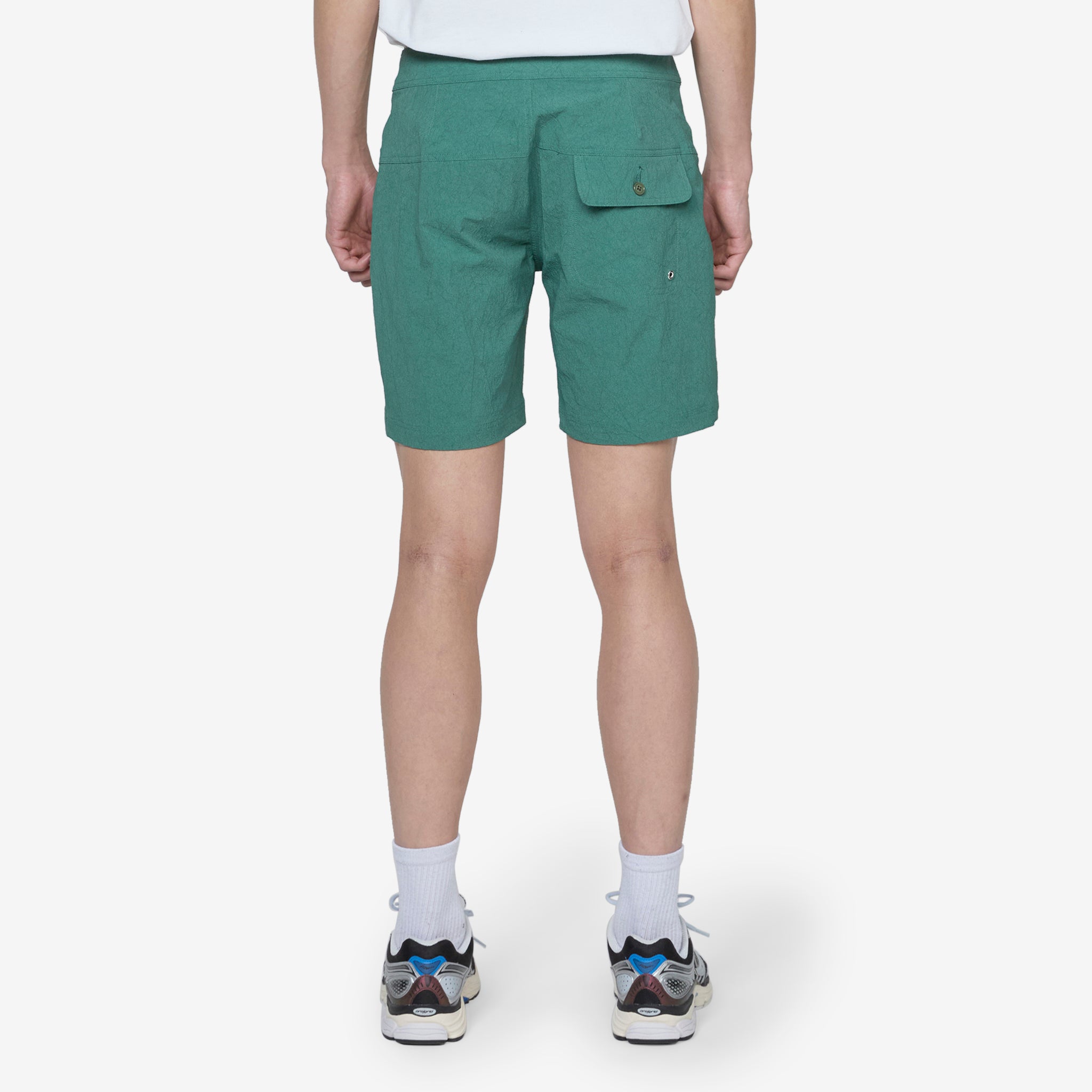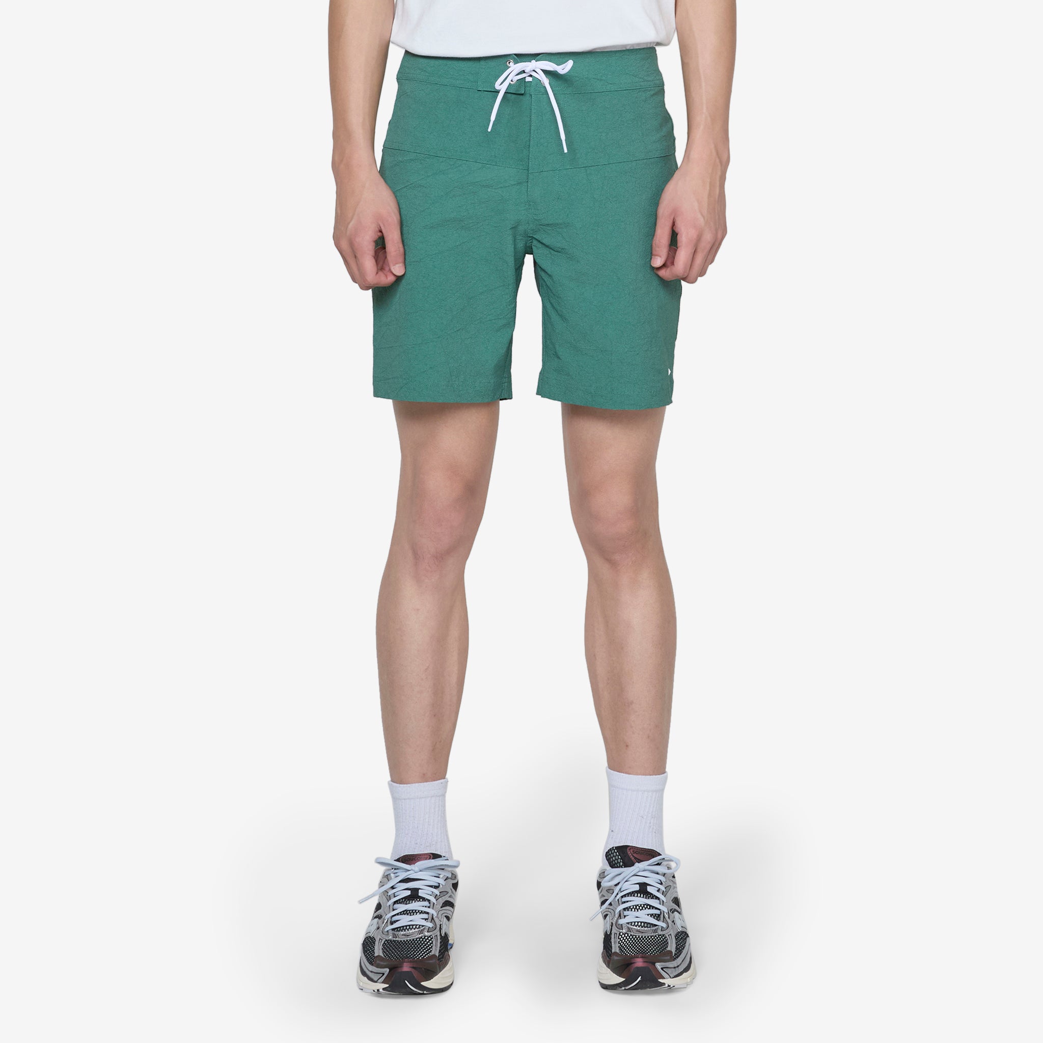 Men's Quigg Boardshort in Green from Pilgrim Surf Supply. Relaxed fit board shorts with a drawstring waistband. Crafted from a nylon fabric for quick-drying and stretch properties. Finished with a single back pocket with a key loop.