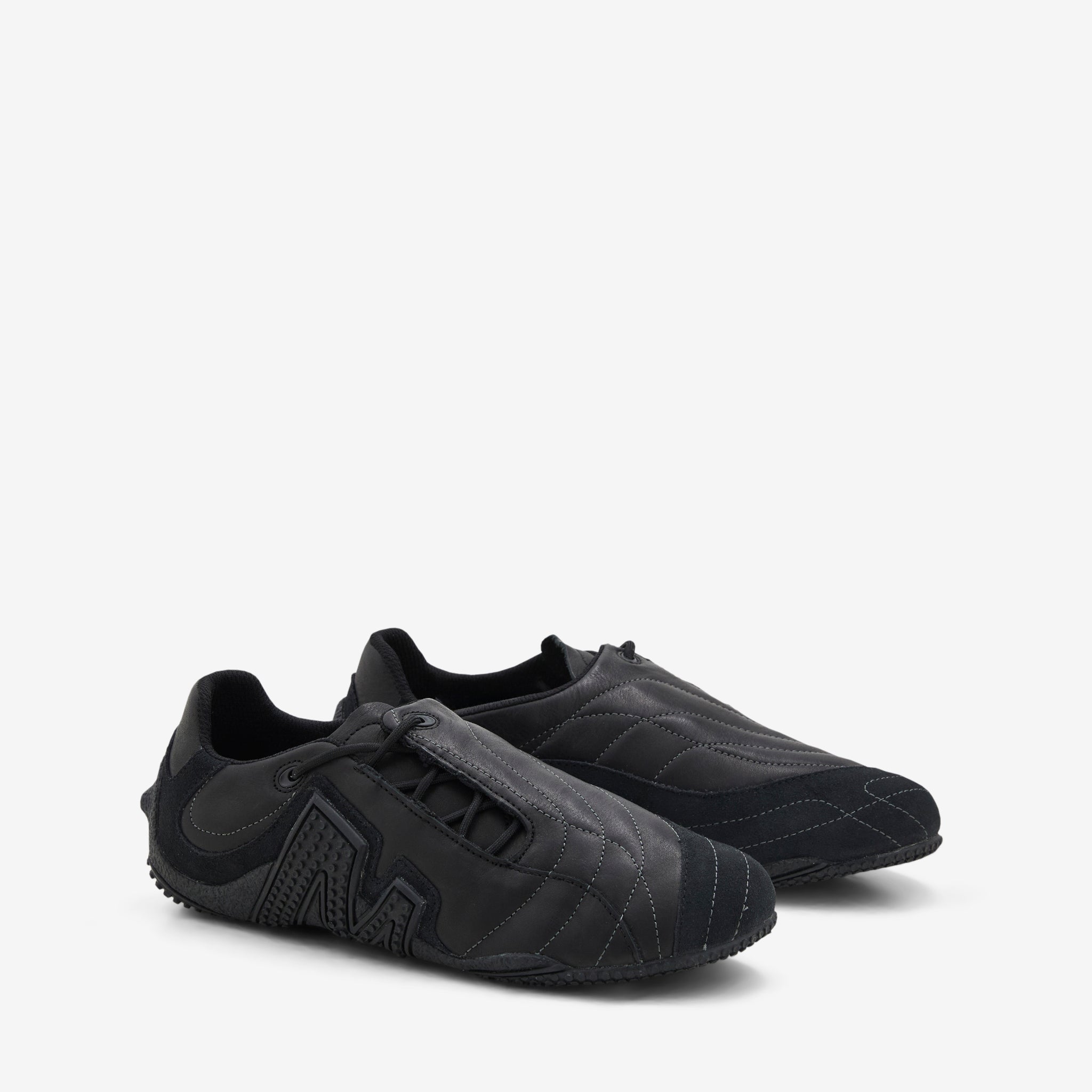 Men's Relay Web in Black from Merrell 1TRL. Low profile silhouette featuring a full grain leather upper with asymmetrical lace closure, breathable mesh lining, a suede toecap and quilted details. EVA foam footbed provides comfort and traction. Rubber outsole wraps up the heel for support and at the arch for subtle branding.