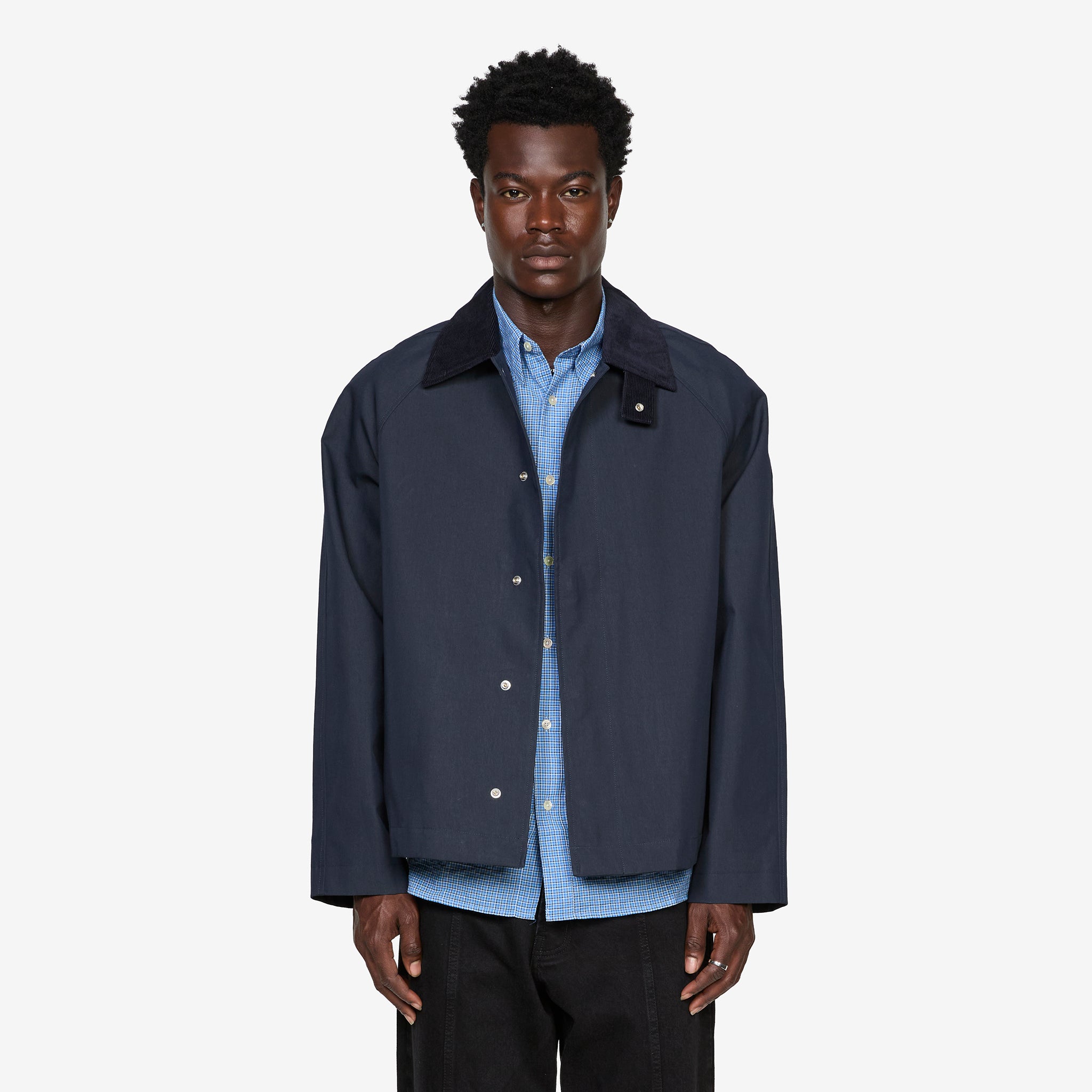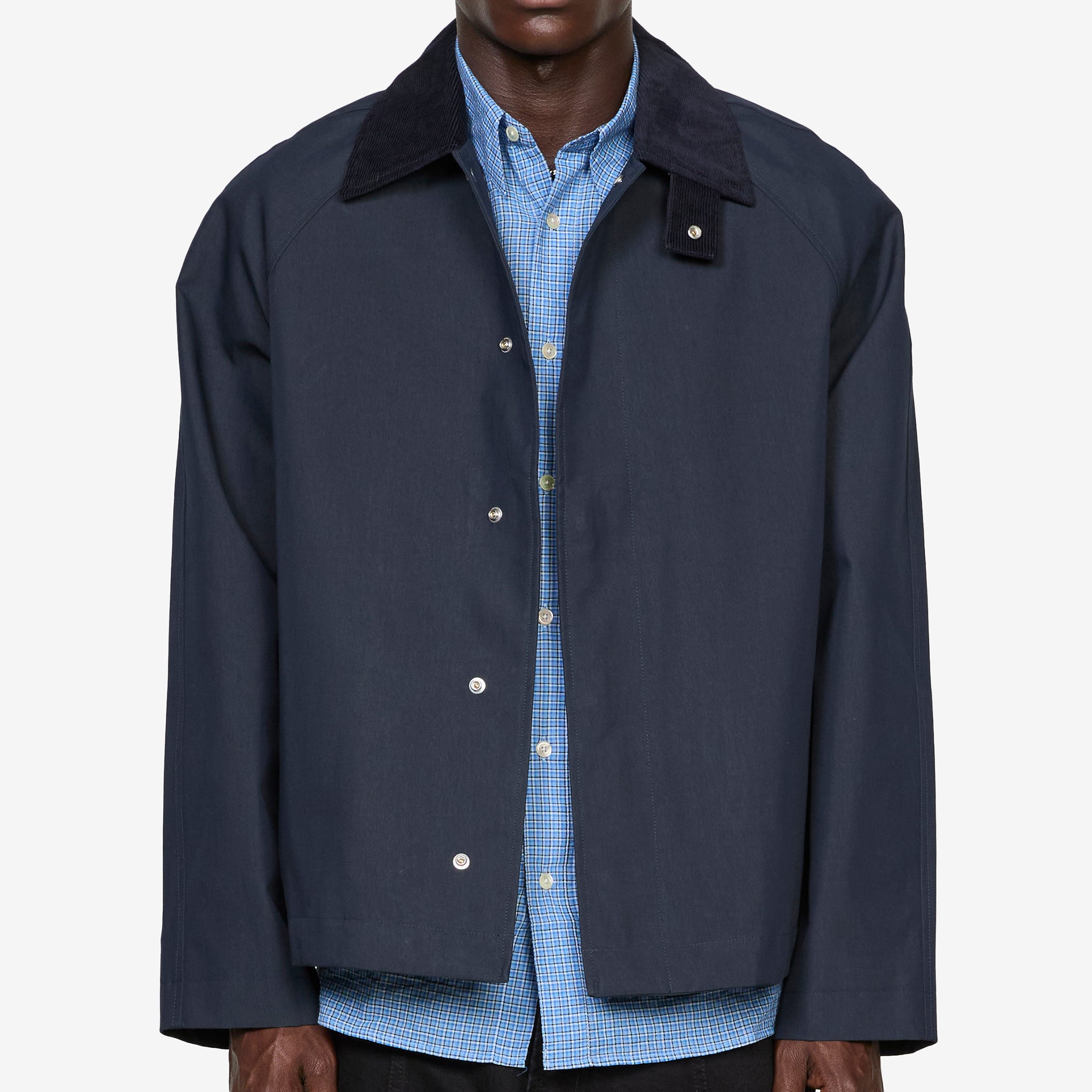 Short Raglan Coat in Navy from Sunflower. Relaxed, cropped fit trench coat with a classic collar, silver metal snap closure, raglan style sleeves and slip side pockets. Crafted from a durable cotton and nylon fabric that protects against wind and rain. Finished with integrated storm flap at the neck and 2 interior pockets.
