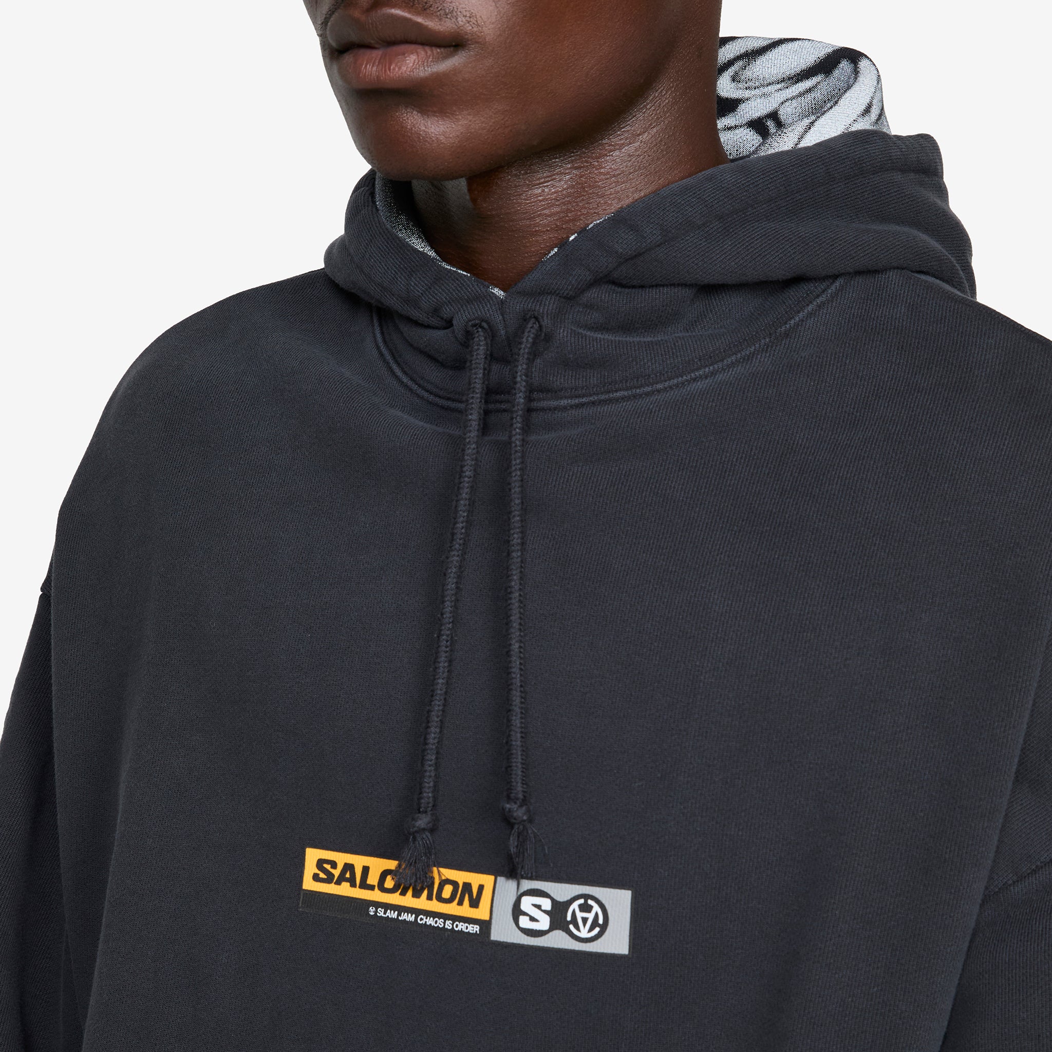 Slam Jam collaborates with Salomon on the Hoodie in Deep Black. Relaxed, oversized fit hoodie with a drawstring adjustable hood, kangaroo pocket, a ribbed hem and cuffs with functional thumb loops. Crafted from heavyweight organic cotton with a collaborative graphic print in the inner hood. Finished with printed collaborative branding at the chest.