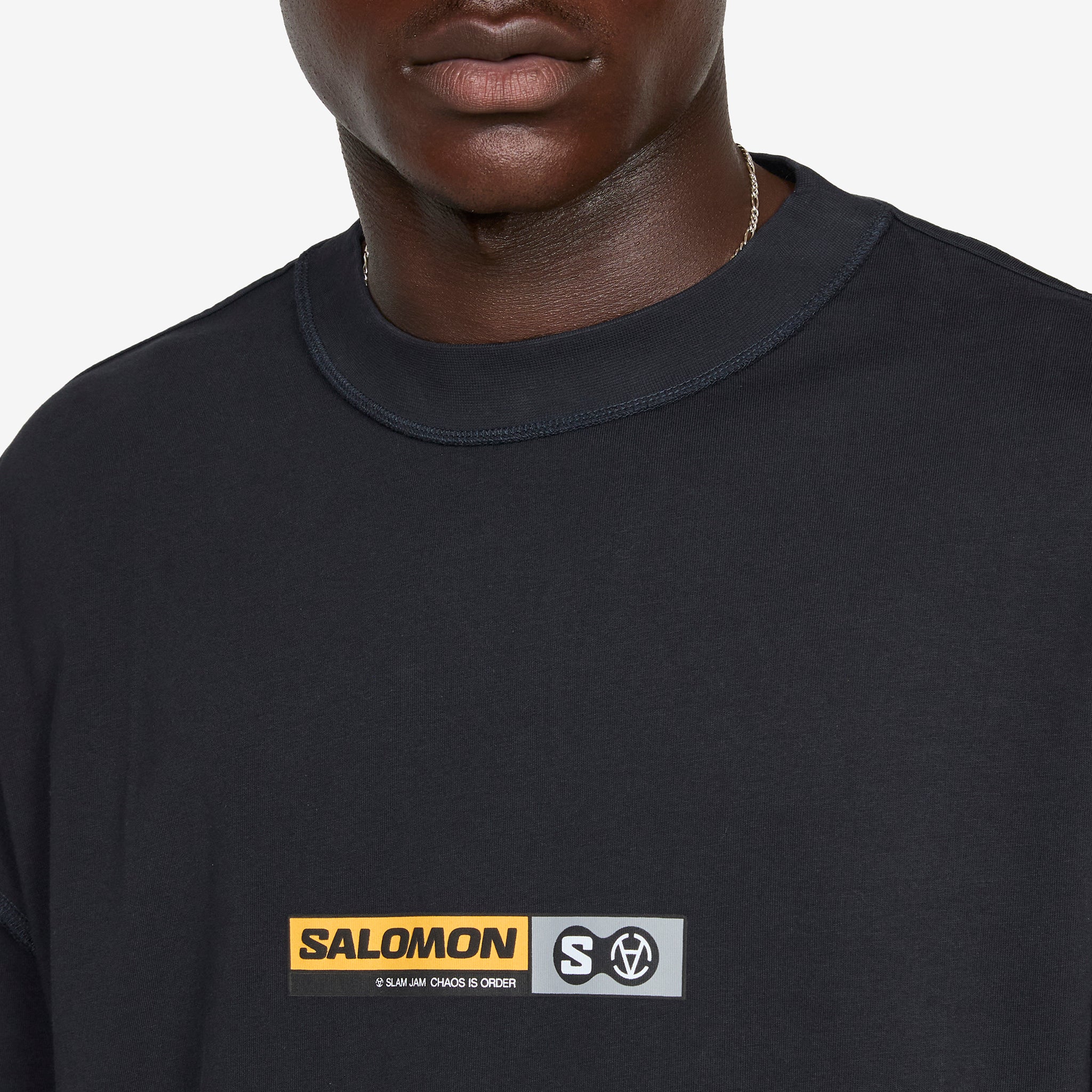 Slam Jam collaborates with Salomon on the Longsleeve T-Shirt in Deep Black and White. Relaxed, oversized fit longsleeve t-shirt with a ribbed crew neckline, dropped shoulders and ribbed cuffs. Crafted from organic cotton with topstitch detailing and layered sleeves. Finished with printed collaborative graphics at the sleeves and chest.
