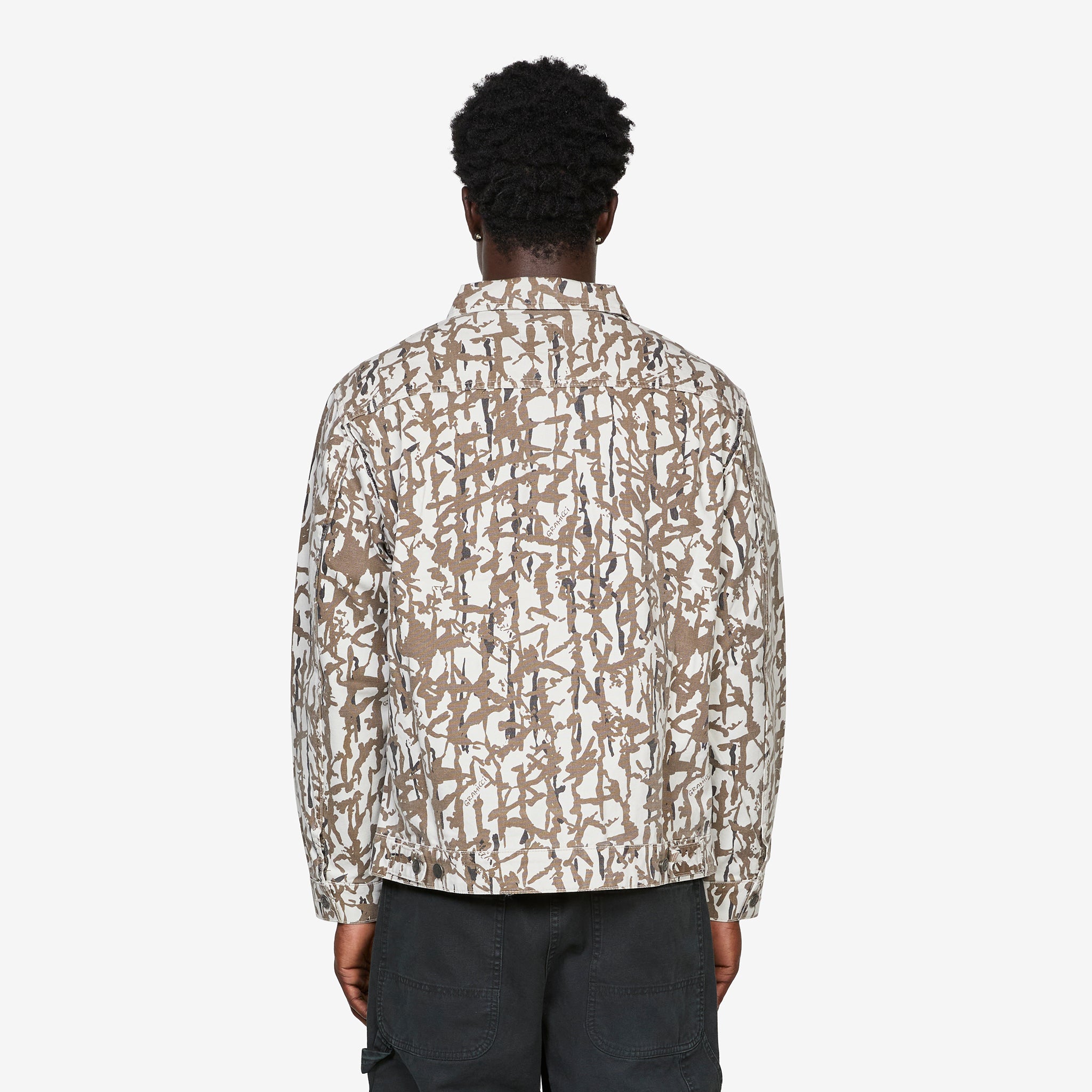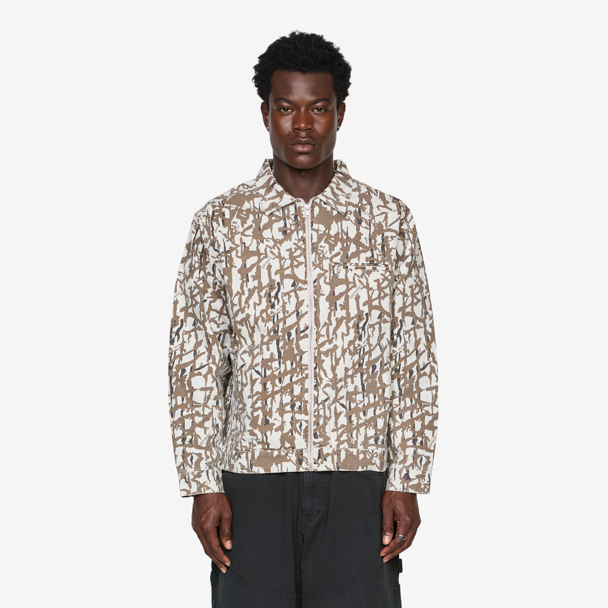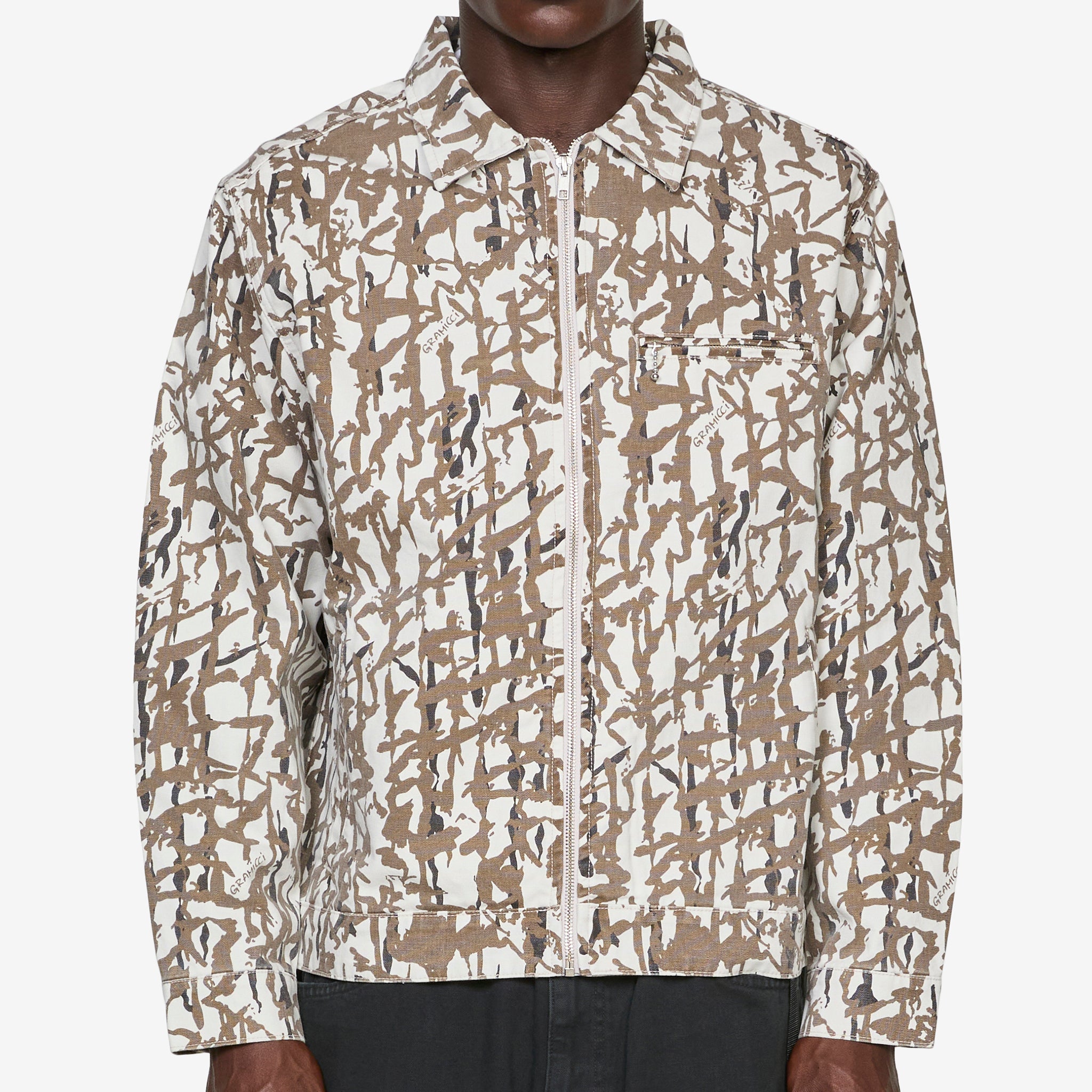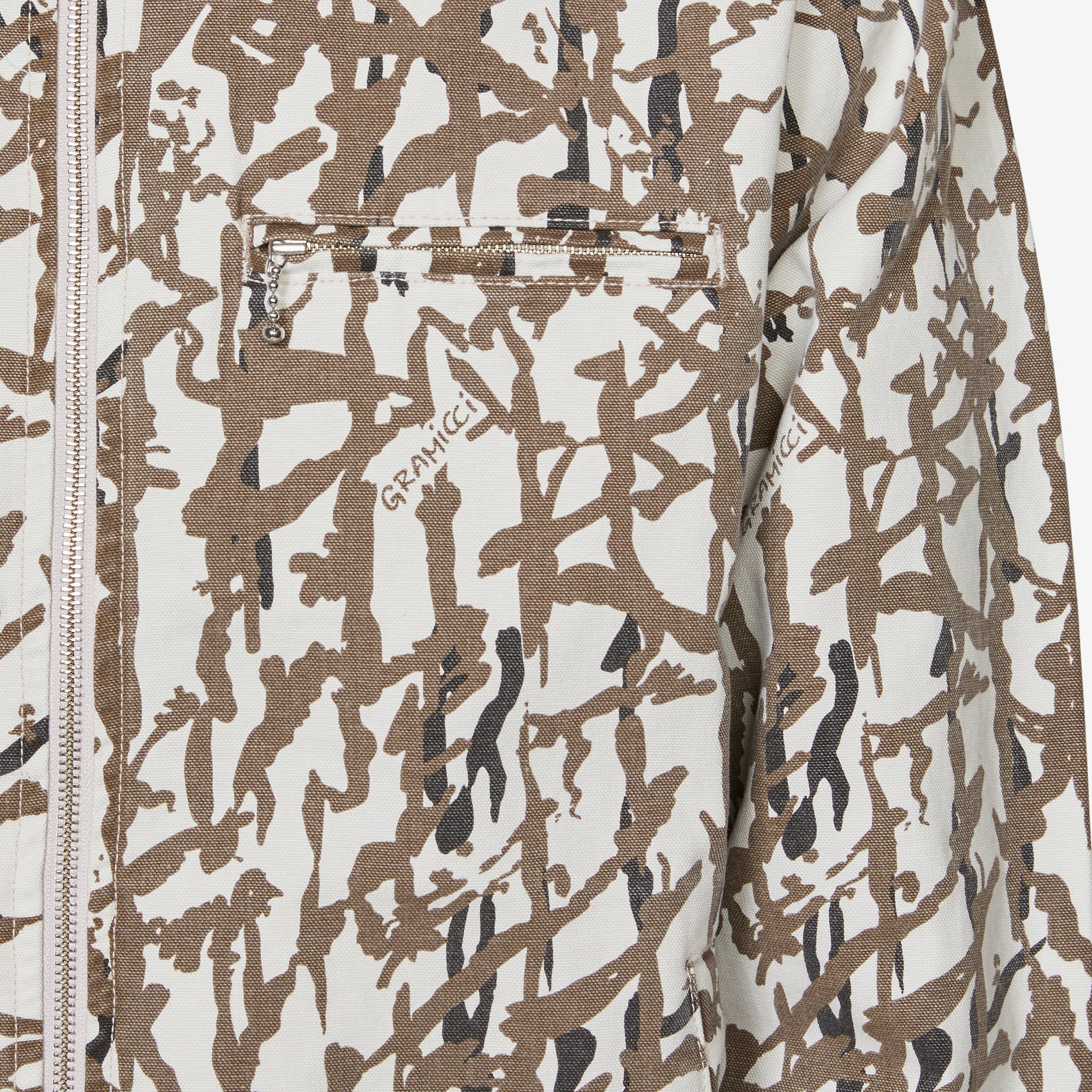 Taos Canvas Jacket in Grey Reed from Gramicci. Regular fit jacket with a slightly cropped silhouette, zip closure and two slit pockets. Crafted from a durable 9oz cotton canvas washed fabric and finished with a camo pattern throughout and subtle branded label on the front slit pocket.