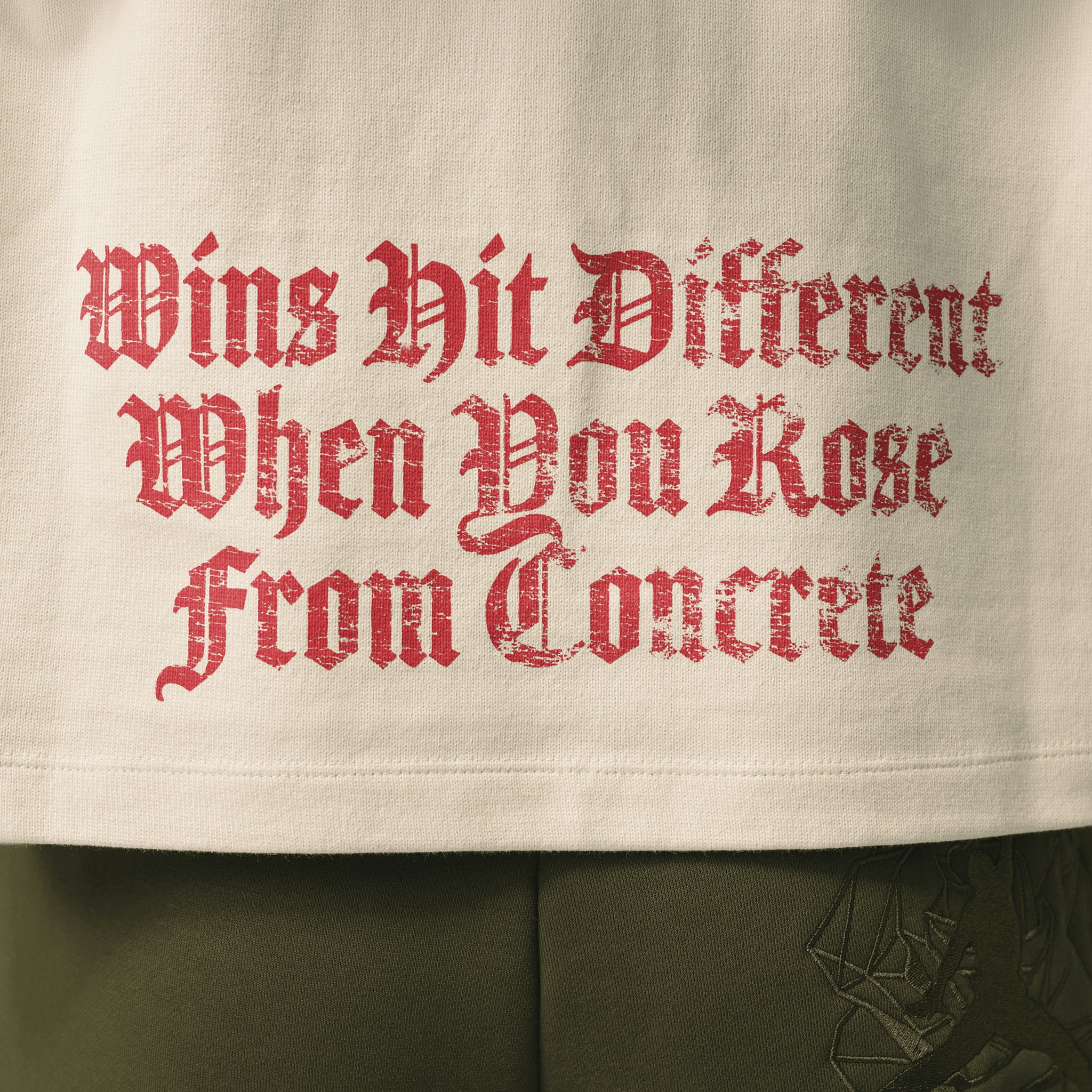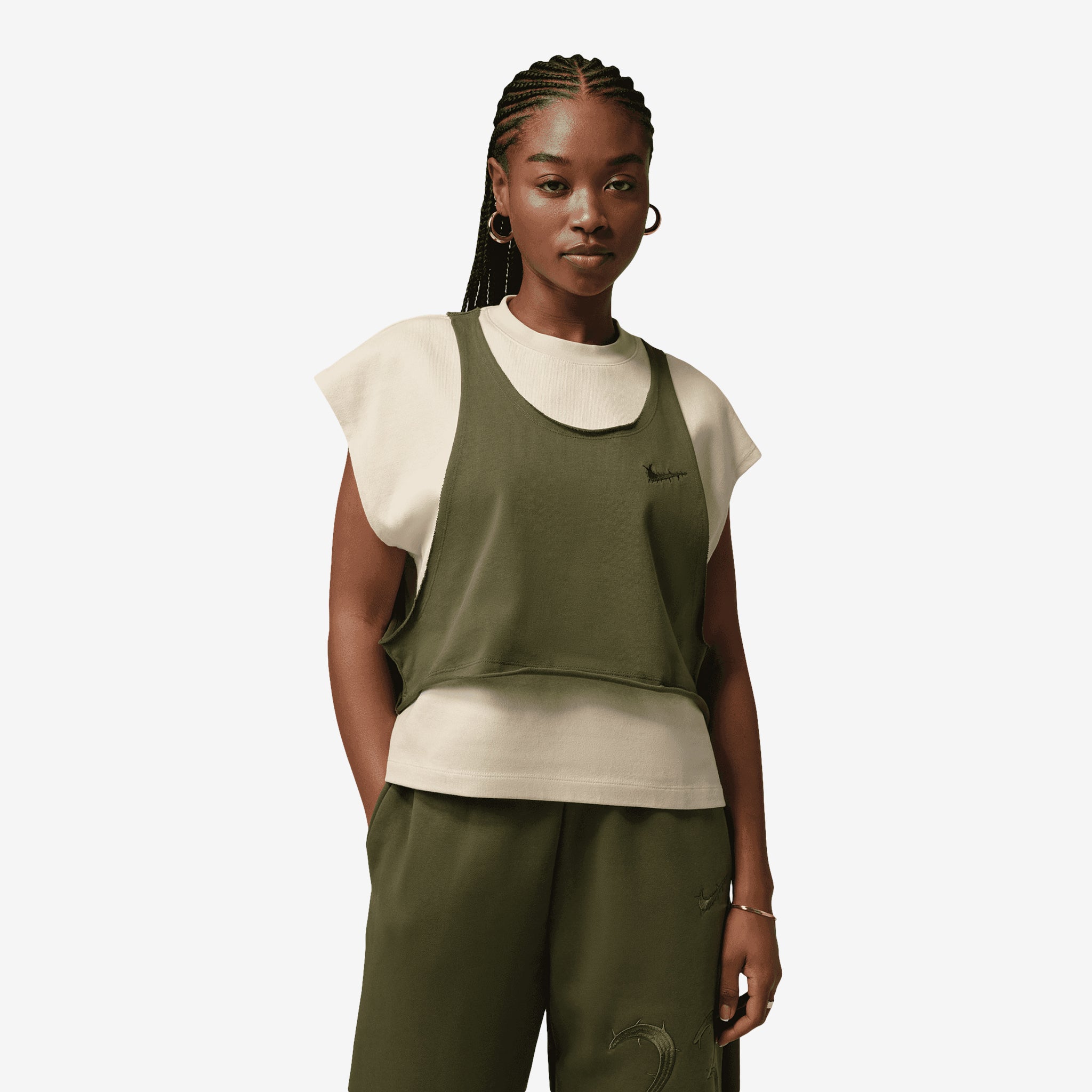 Teyana Taylor collaborates with Jordan Brand on the Short-Sleeve T-Shirt in Coconut Milk, Rough Green and Black. Regular fit t-shirth with a ribbed crew neckline, shortened sleeves and layered construction. Crafted from soft cotton with a contrast jersey-shaped layer. Finished with printed and embroidered collaborative branding throughout.